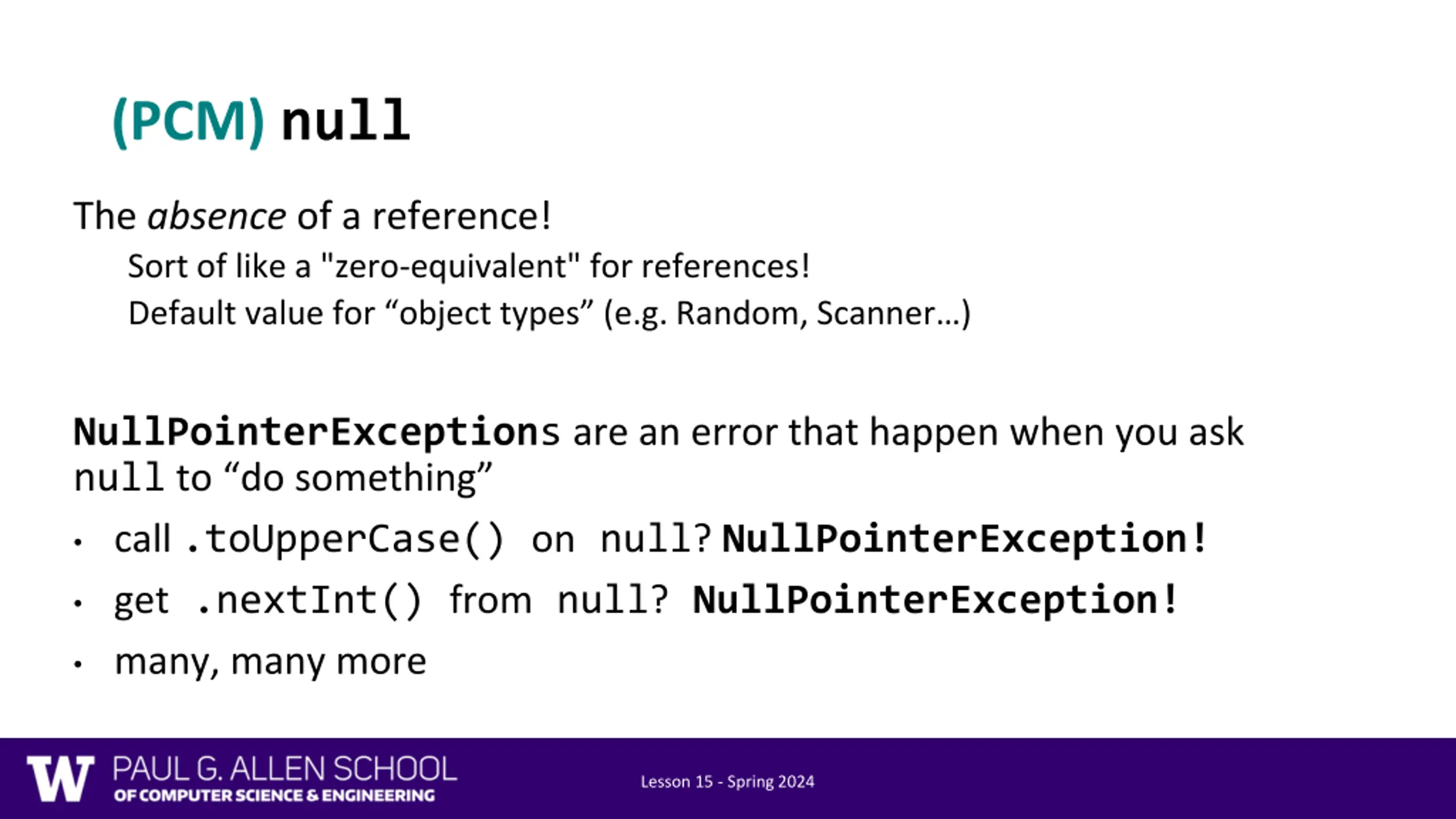 (PCM) null The absence of a reference! Sort of like a "zero-equivalent" for references! Default value for object types (e.g. Random, Scanner ) NullPointerExceptions are an error that happen when you ask null to do something call .toUpperCase() on null? NullPointerException! get .nextInt() from null? NullPointerException! many, many more Lesson 15 - Spring 2024
