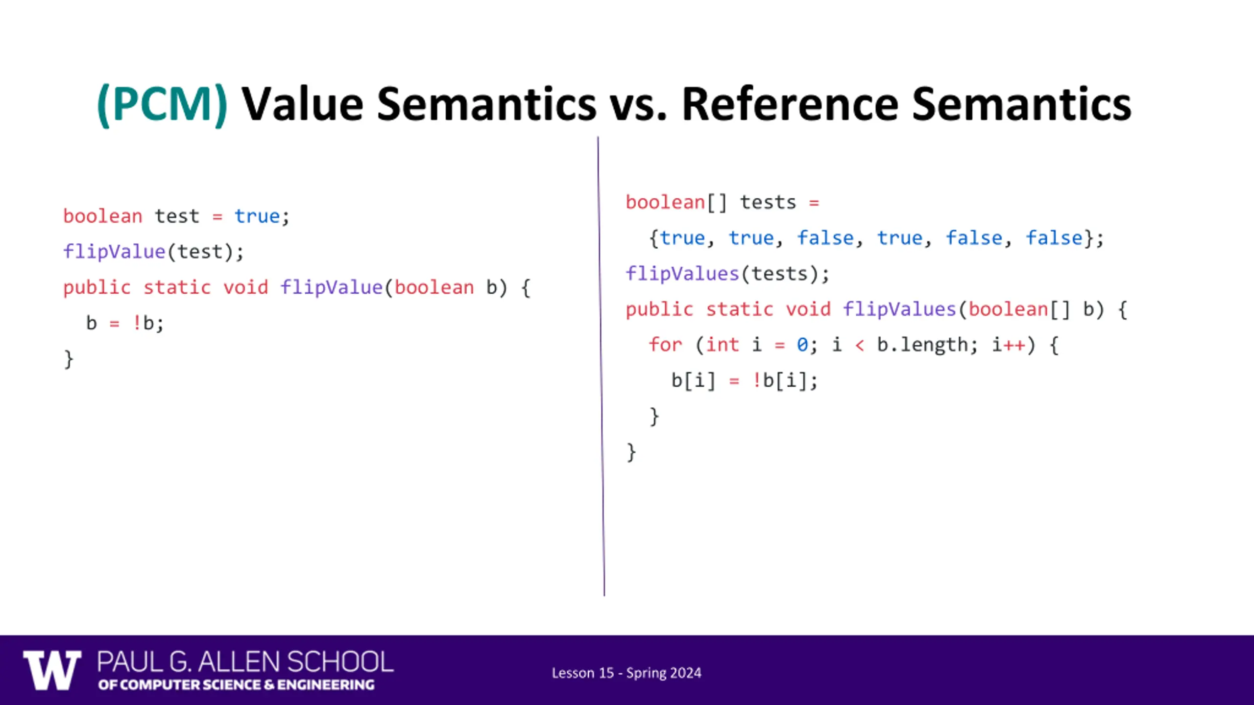 (PCM) Value Semantics vs. Reference Semantics boolean[] tests = boolean test = true; {true, true, false, true, false, false}; flipValue(test); flipValues(tests); public static void flipValue(boolean b) { public static void flipValues(boolean[] b) { b = !b; for (int i = 0; i < b.length; i++) { } b[i] = !b[i]; } } Lesson 15 - Spring 2024