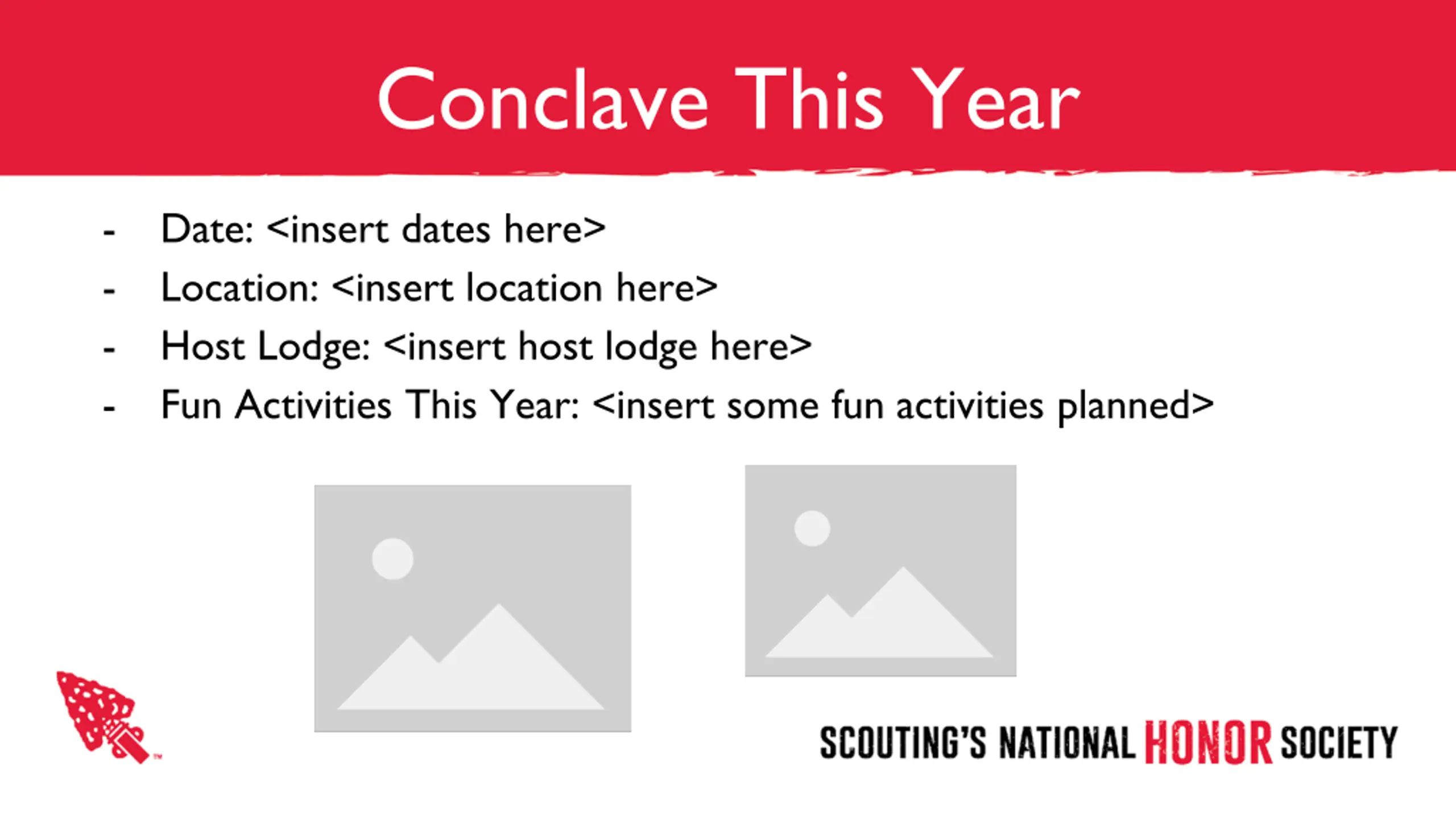 Conclave This Year - - - - Date: <insert dates here> Location: <insert location here> Host Lodge: <insert host lodge here> Fun Activities This Year: <insert some fun activities planned>