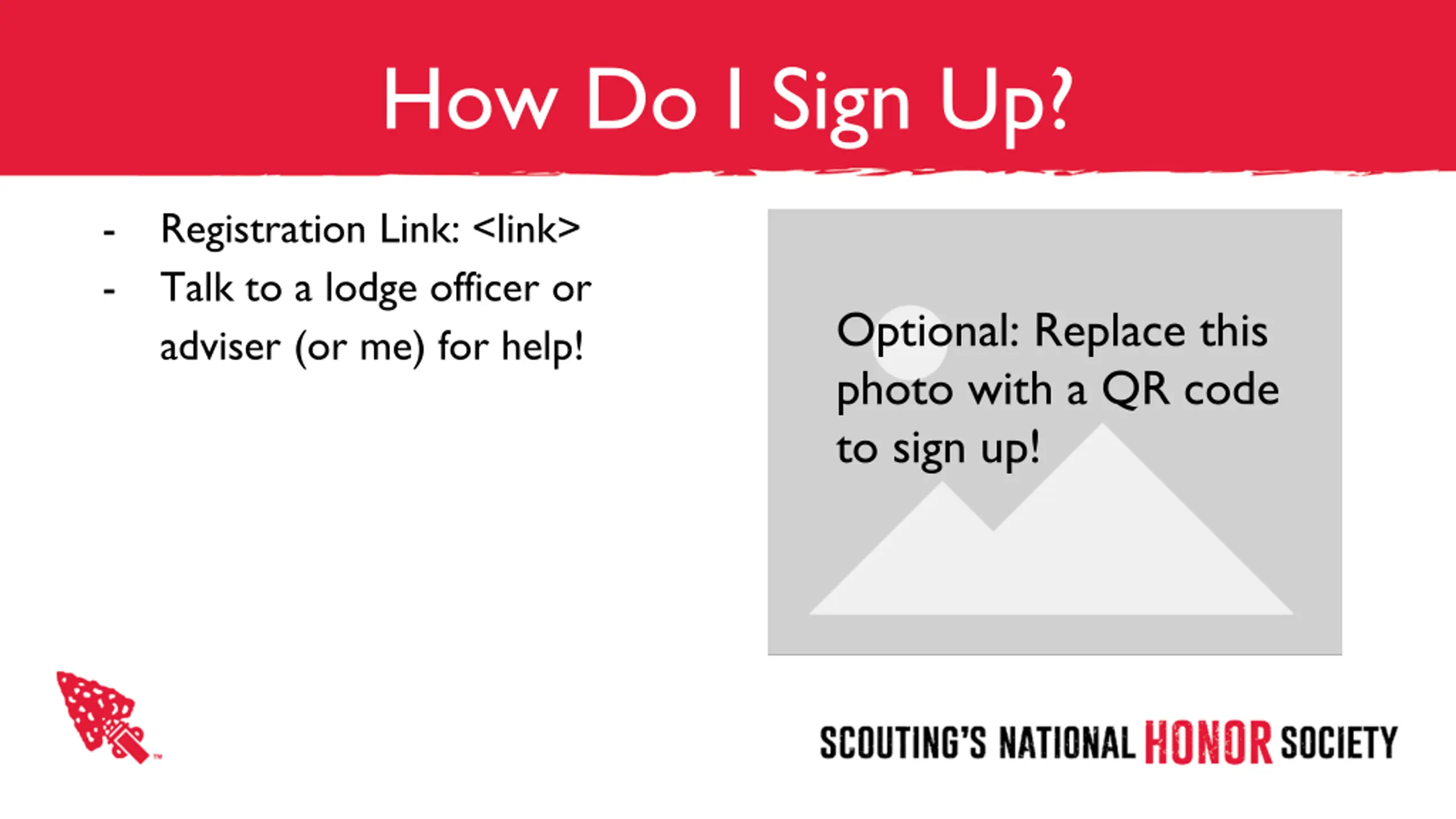 How Do I Sign Up? - - Registration Link: <link> Talk to a lodge officer or adviser (or me) for help! Optional: Replace this photo with a QR code to sign up!