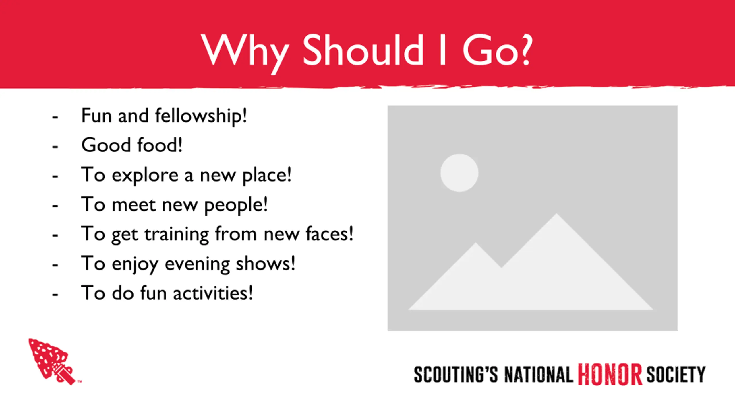 Why Should I Go? - - - - - - - Fun and fellowship! Good food! To explore a new place! To meet new people! To get training from new faces! To enjoy evening shows! To do fun activities!