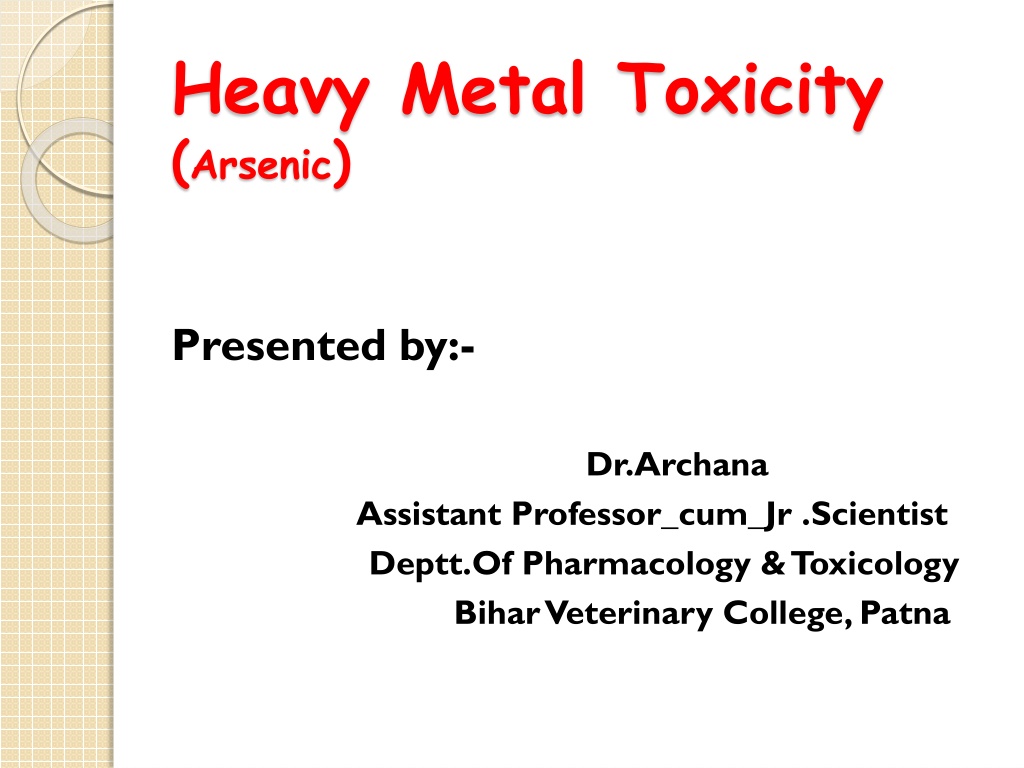 Heavy Metal Toxicity (Arsenic) Presented by:- Dr.Archana Assistant Professor_cum_Jr .Scientist Deptt.Of Pharmacology & Toxicology Bihar Veterinary College, Patna