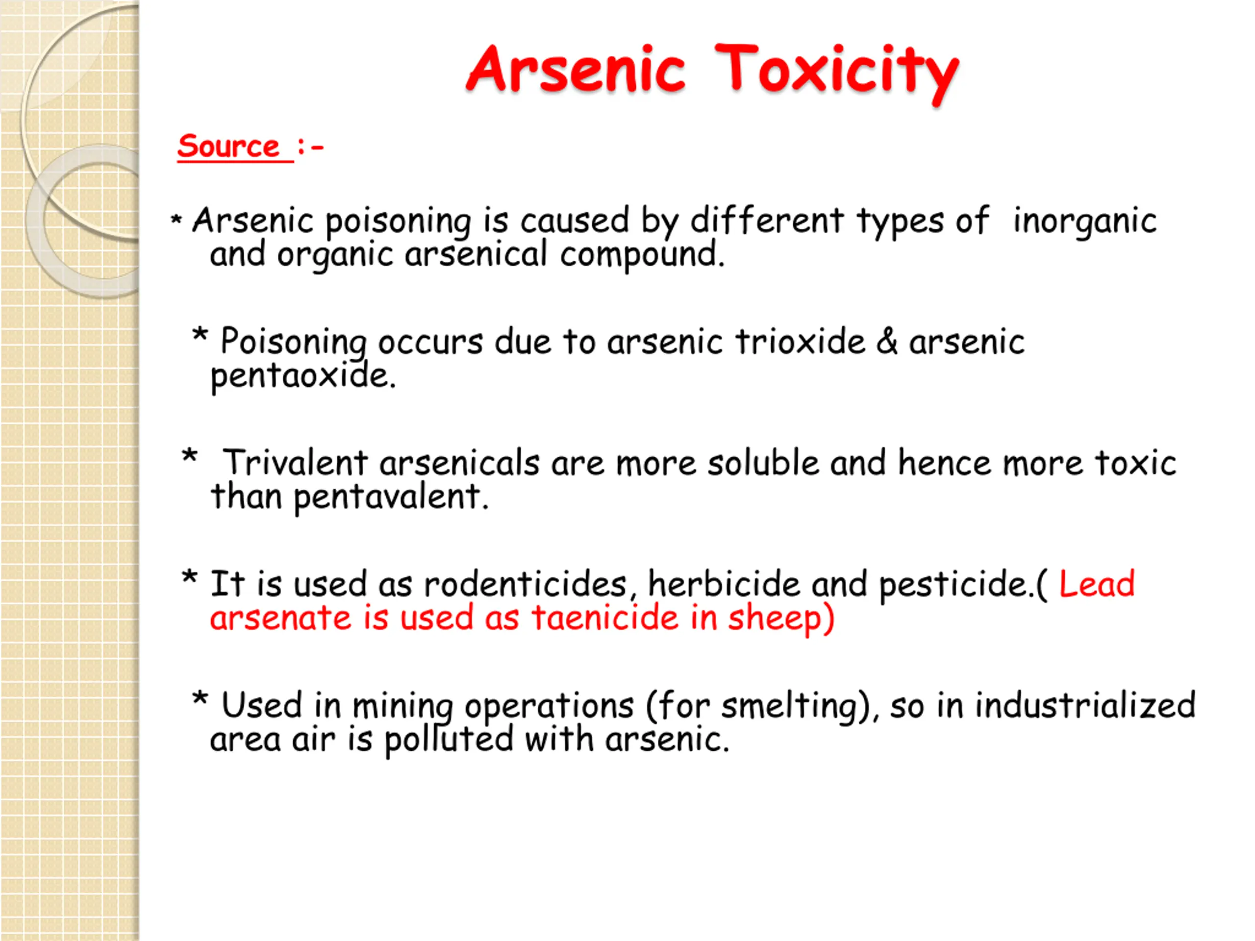 Arsenic Toxicity Source :- * Arsenic poisoning is caused by different types of inorganic and organic arsenical compound. * Poisoning occurs due to arsenic trioxide & arsenic pentaoxide. * Trivalent arsenicals are more soluble and hence more toxic than pentavalent. * It is used as rodenticides, herbicide and pesticide.( Lead arsenate is used as taenicide in sheep) * Used in mining operations (for smelting), so in industrialized area air is polluted with arsenic.