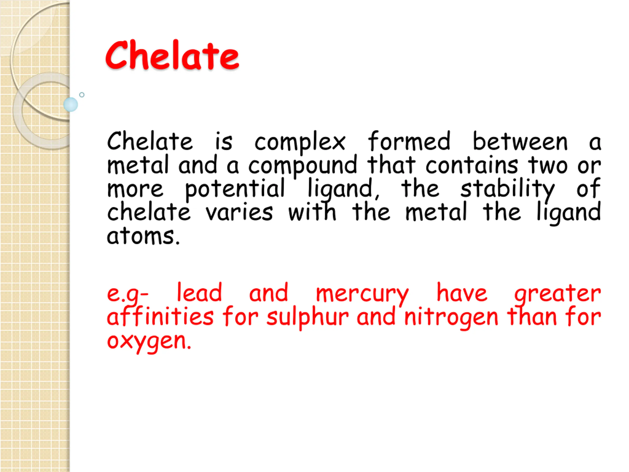 Chelate Chelate is complex formed between a metal and a compound that contains two or more potential ligand, the stability of chelate varies with the metal the ligand atoms. e.g- affinities for sulphur and nitrogen than for oxygen. lead and mercury have greater
