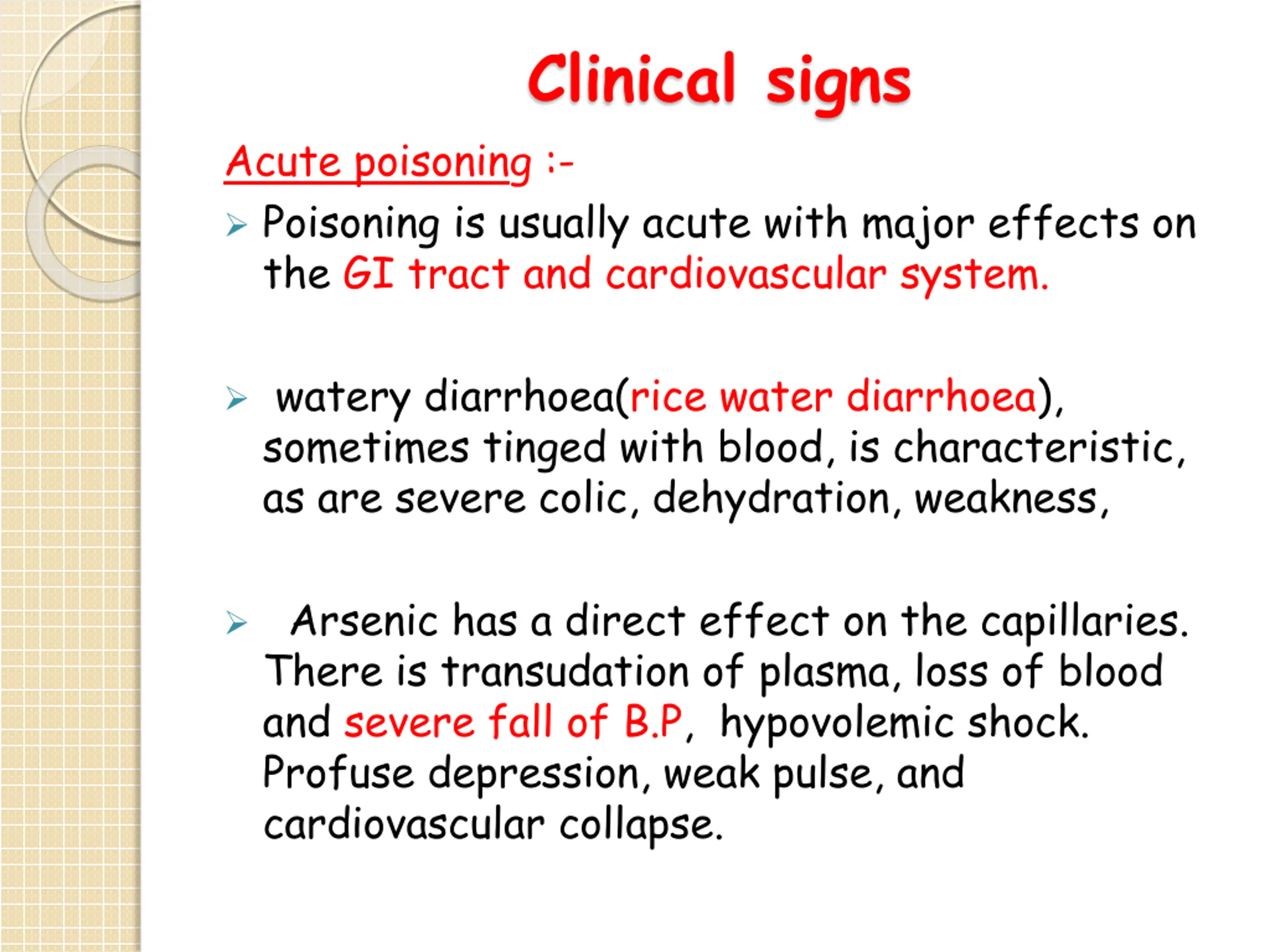 Clinical signs Acute poisoning :- Poisoning is usually acute with major effects on the GI tract and cardiovascular system. watery diarrhoea(rice water diarrhoea), sometimes tinged with blood, is characteristic, as are severe colic, dehydration, weakness, Arsenic has a direct effect on the capillaries. There is transudation of plasma, loss of blood and severe fall of B.P, hypovolemic shock. Profuse depression, weak pulse, and cardiovascular collapse.