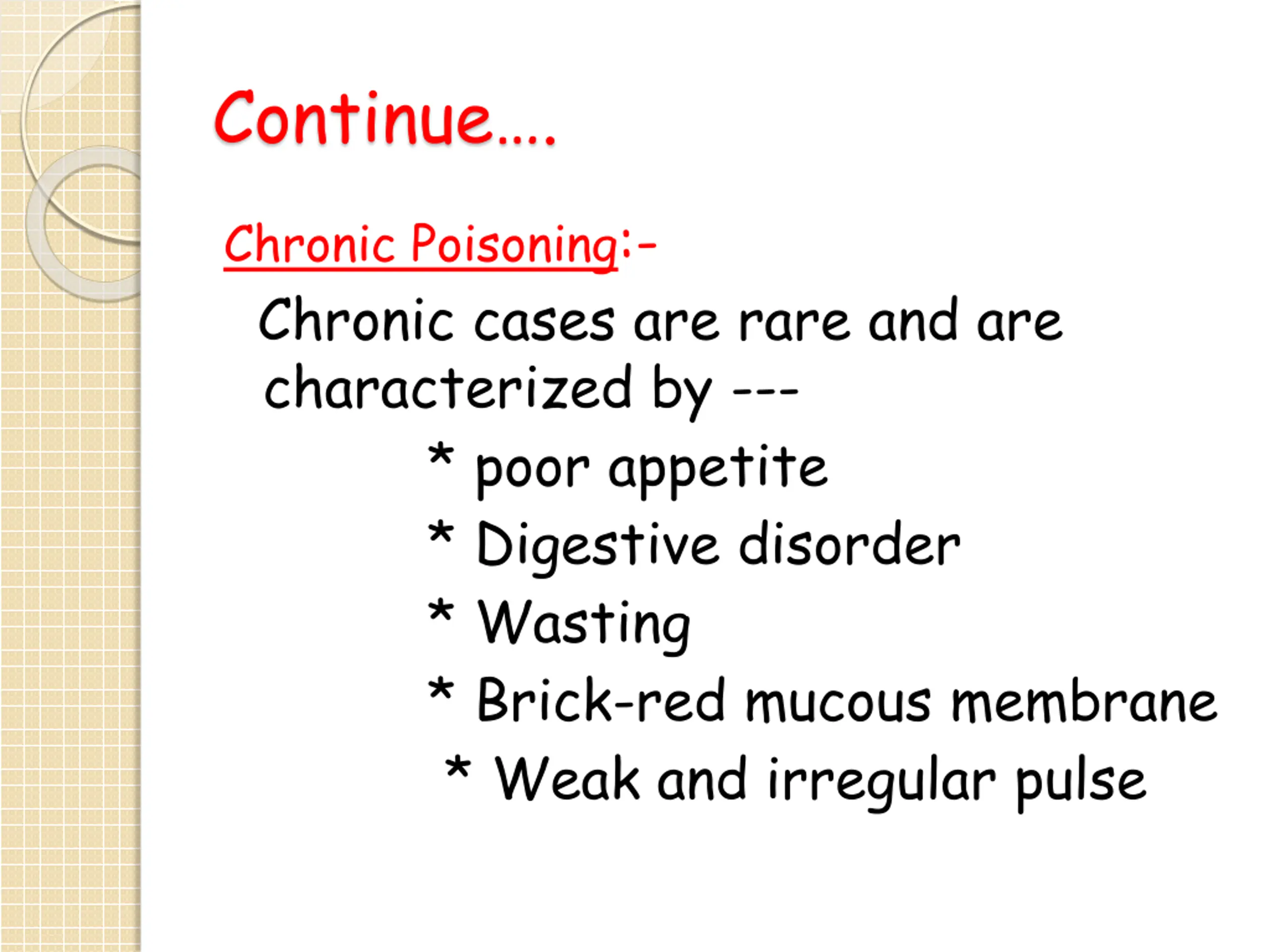 Continue. Chronic Poisoning:- Chronic cases are rare and are characterized by --- * poor appetite * Digestive disorder * Wasting * Brick-red mucous membrane * Weak and irregular pulse