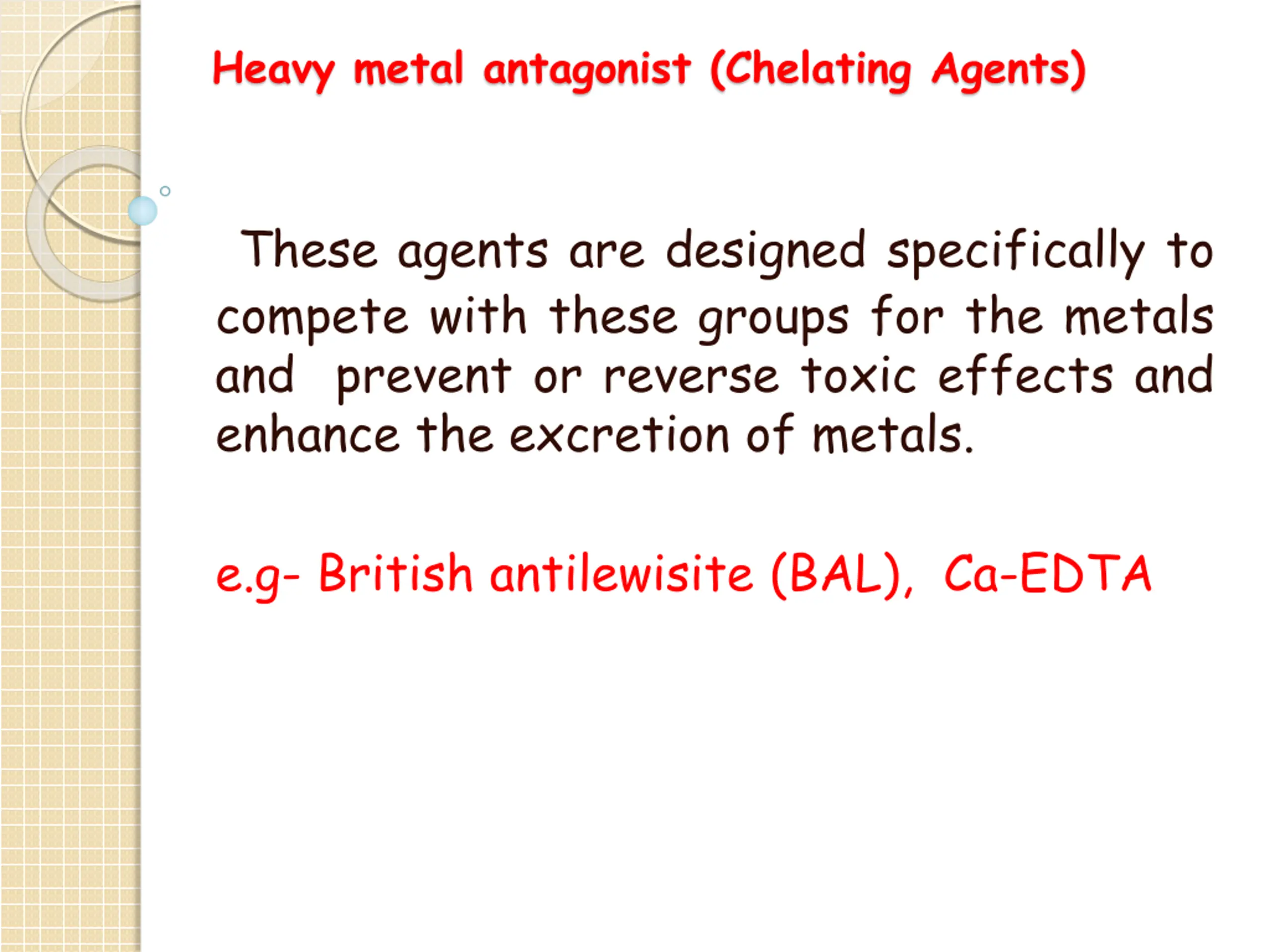 Heavy metal antagonist (Chelating Agents) These agents are designed specifically to compete with these groups for the metals and prevent or reverse toxic effects and enhance the excretion of metals. e.g- British antilewisite (BAL), Ca-EDTA