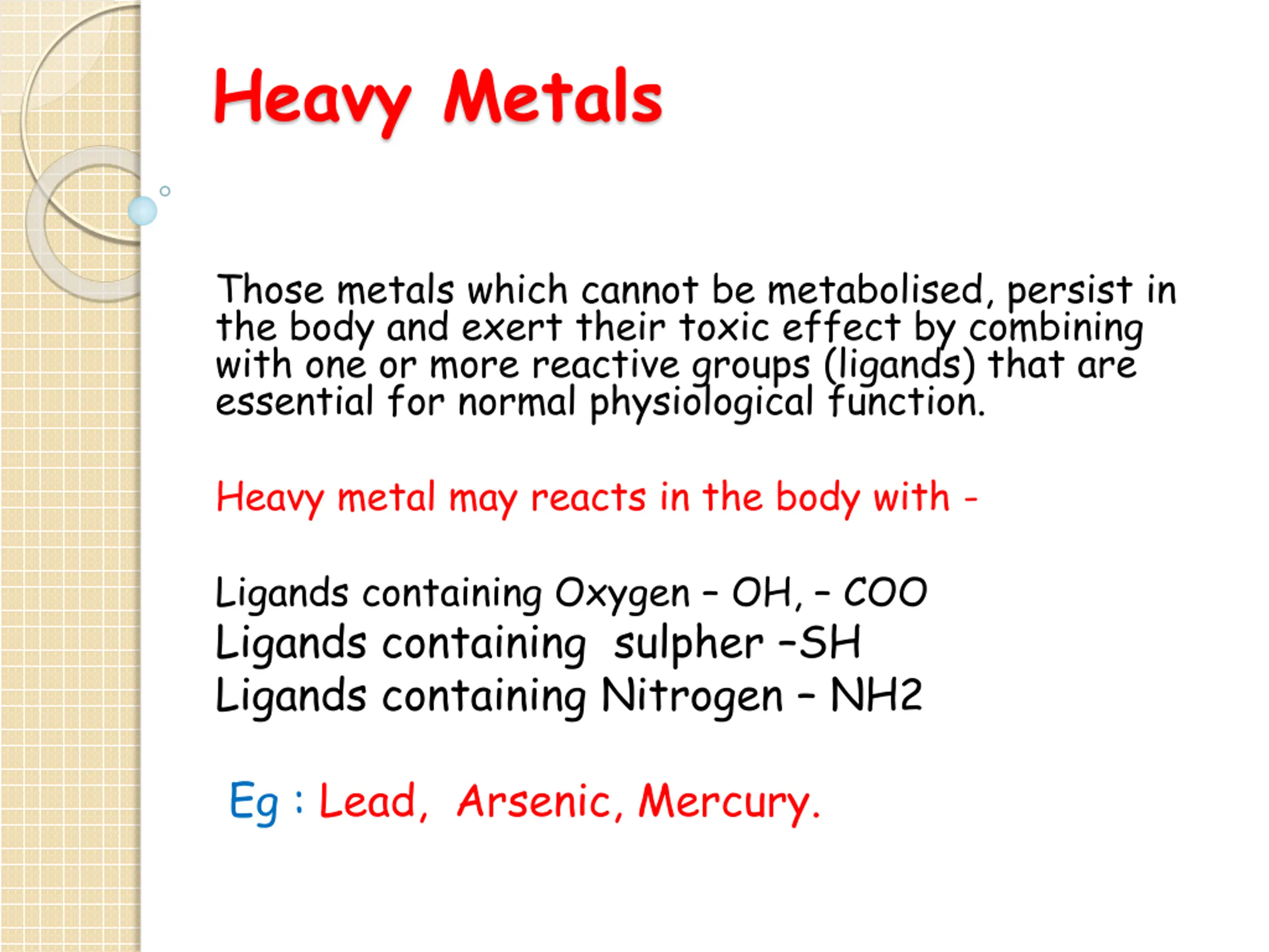 Heavy Metals Those metals which cannot be metabolised, persist in the body and exert their toxic effect by combining with one or more reactive groups (ligands) that are essential for normal physiological function. Heavy metal may reacts in the body with - Ligands containing Oxygen OH, COO Ligands containing sulpher SH Ligands containing Nitrogen NH2 Eg : Lead, Arsenic, Mercury.