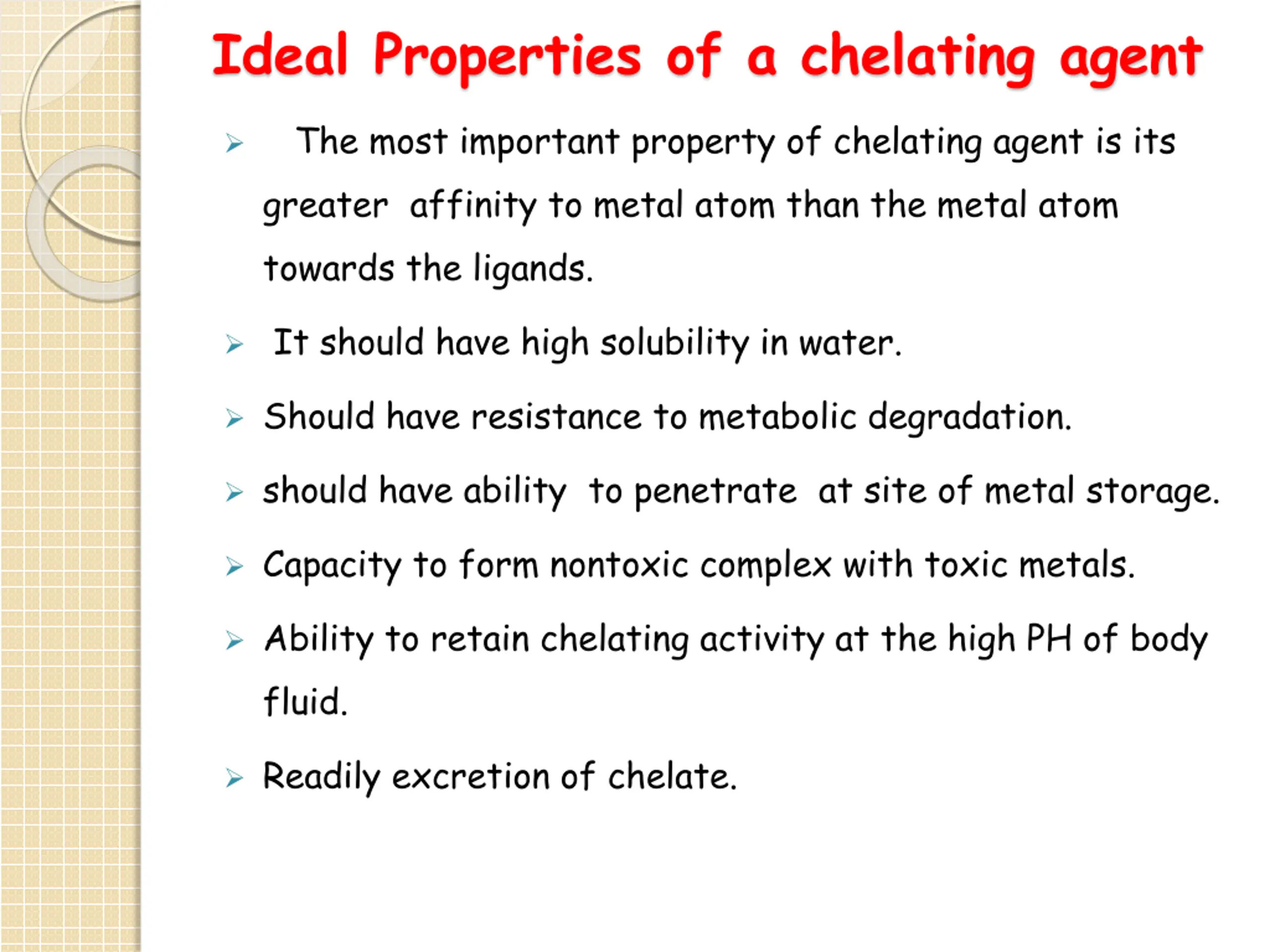 Ideal Properties of a chelating agent The most important property of chelating agent is its greater affinity to metal atom than the metal atom towards the ligands. It should have high solubility in water. Should have resistance to metabolic degradation. should have ability to penetrate at site of metal storage. Capacity to form nontoxic complex with toxic metals. Ability to retain chelating activity at the high PH of body fluid. Readily excretion of chelate.