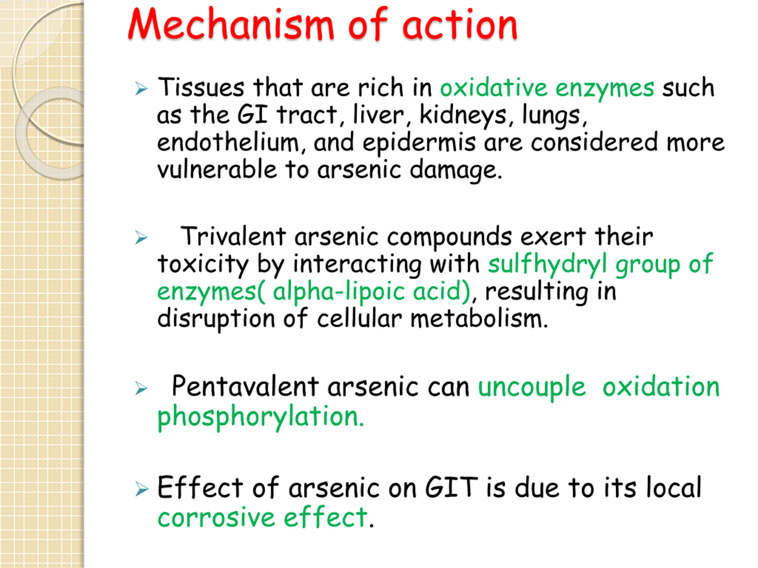 Mechanism of action Tissues that are rich in oxidative enzymes such as the GI tract, liver, kidneys, lungs, endothelium, and epidermis are considered more vulnerable to arsenic damage. Trivalent arsenic compounds exert their toxicity by interacting with sulfhydryl group of enzymes( alpha-lipoic acid), resulting in disruption of cellular metabolism. Pentavalent arsenic can uncouple oxidation phosphorylation. Effect of arsenic on GIT is due to its local corrosive effect.