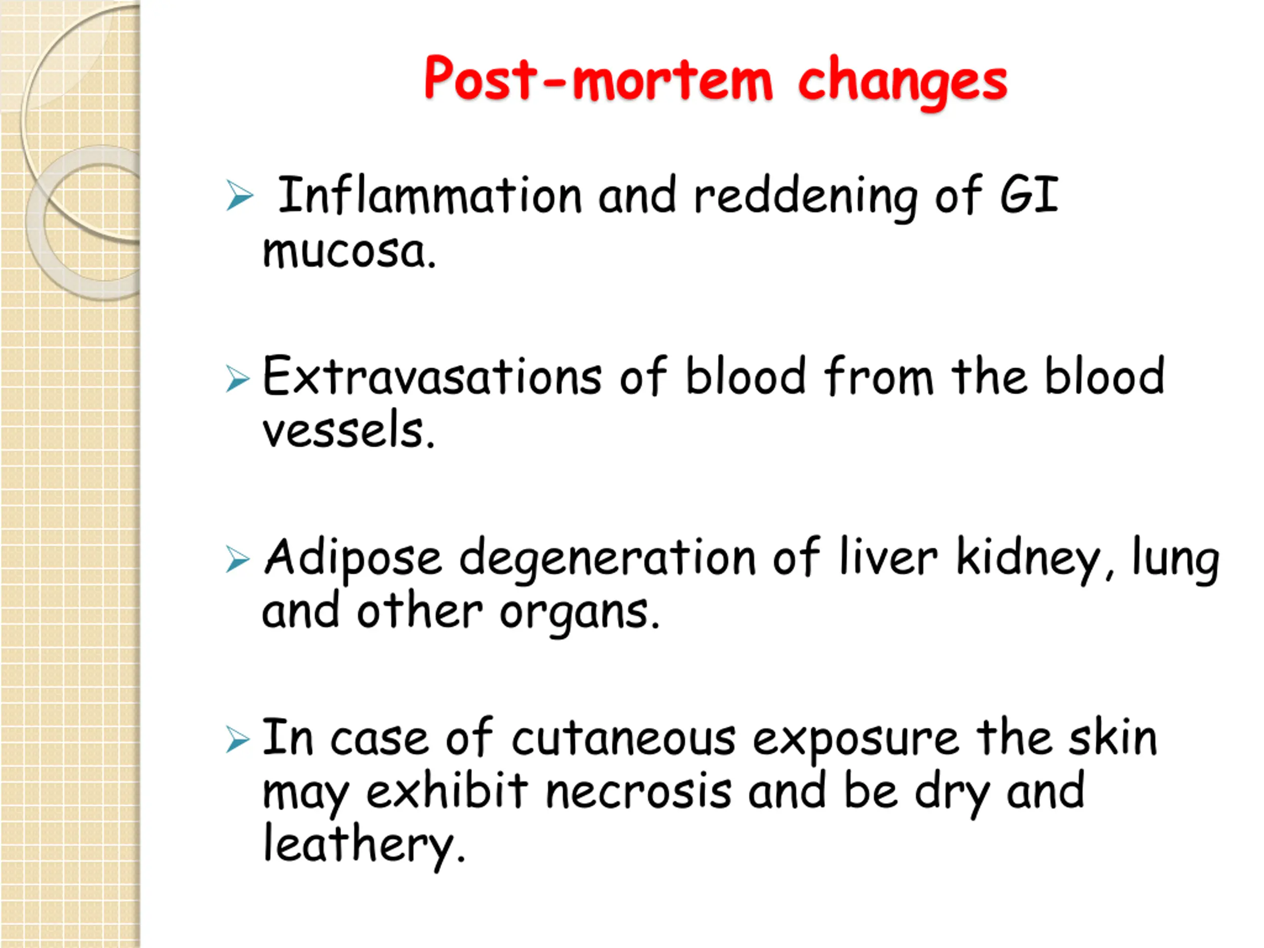 Post-mortem changes Inflammation and reddening of GI mucosa. Extravasations of blood from the blood vessels. Adipose degeneration of liver kidney, lung and other organs. In case of cutaneous exposure the skin may exhibit necrosis and be dry and leathery.