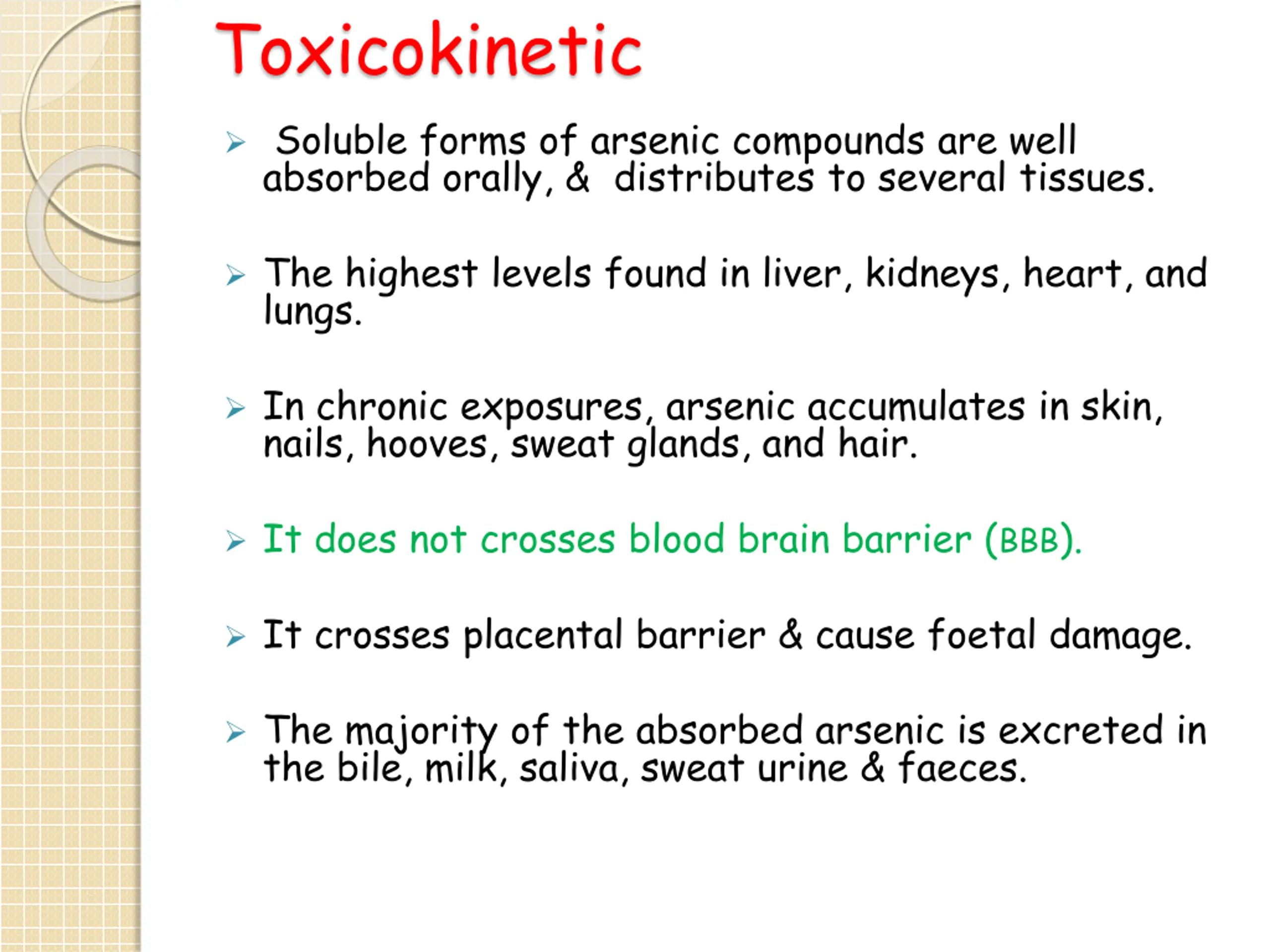 Toxicokinetic Soluble forms of arsenic compounds are well absorbed orally, & distributes to several tissues. The highest levels found in liver, kidneys, heart, and lungs. In chronic exposures, arsenic accumulates in skin, nails, hooves, sweat glands, and hair. It does not crosses blood brain barrier (BBB). It crosses placental barrier & cause foetal damage. The majority of the absorbed arsenic is excreted in the bile, milk, saliva, sweat urine & faeces.