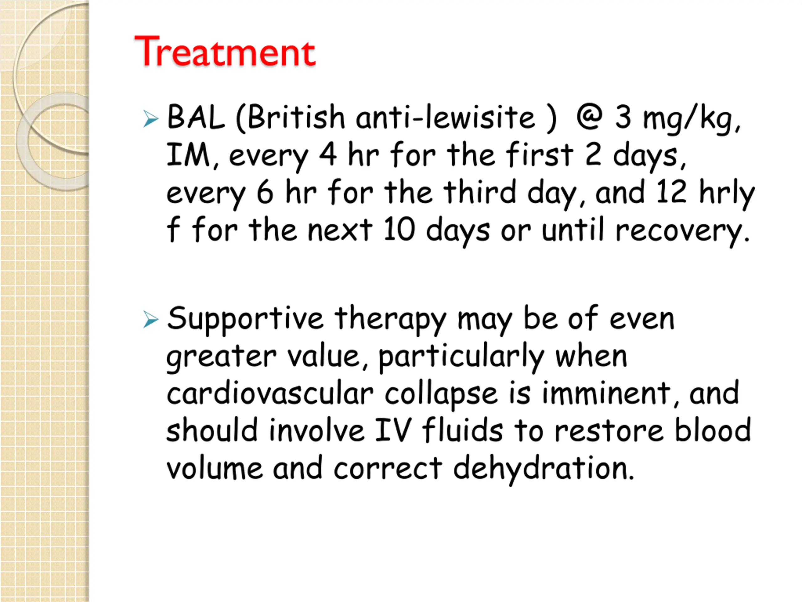 Treatment BAL (British anti-lewisite ) @ 3 mg/kg, IM, every 4 hr for the first 2 days, every 6 hr for the third day, and 12 hrly f for the next 10 days or until recovery. Supportive therapy may be of even greater value, particularly when cardiovascular collapse is imminent, and should involve IV fluids to restore blood volume and correct dehydration.