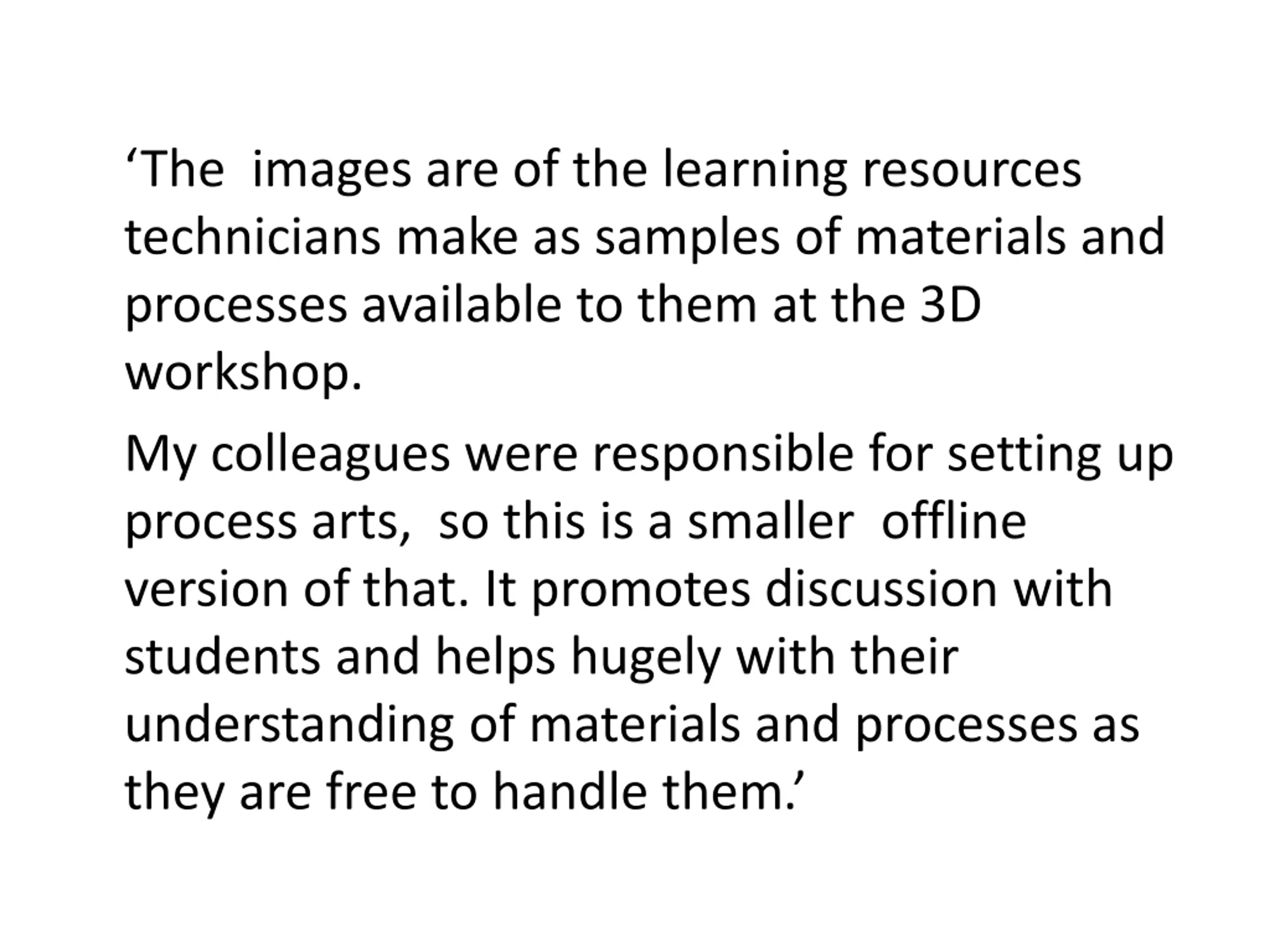 The images are of the learning resources technicians make as samples of materials and processes available to them at the 3D workshop. My colleagues were responsible for setting up process arts, so this is a smaller offline version of that. It promotes discussion with students and helps hugely with their understanding of materials and processes as they are free to handle them.