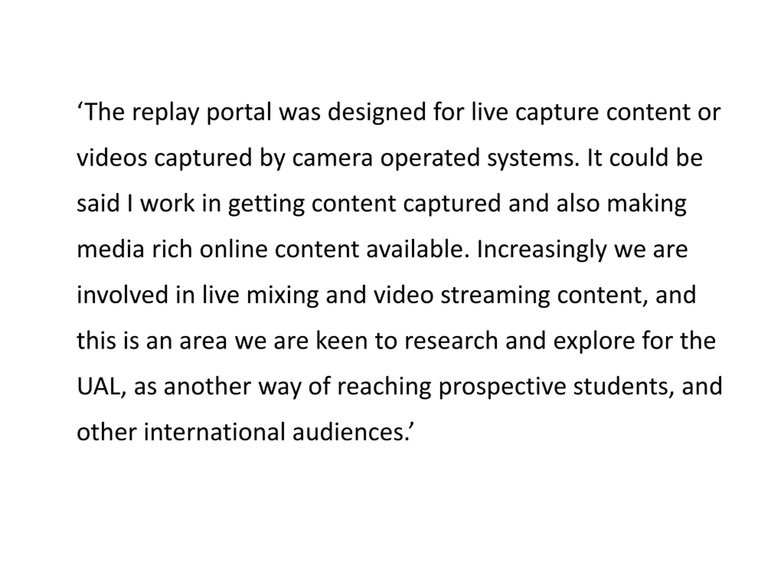 The replay portal was designed for live capture content or videos captured by camera operated systems. It could be said I work in getting content captured and also making media rich online content available. Increasingly we are involved in live mixing and video streaming content, and this is an area we are keen to research and explore for the UAL, as another way of reaching prospective students, and other international audiences.