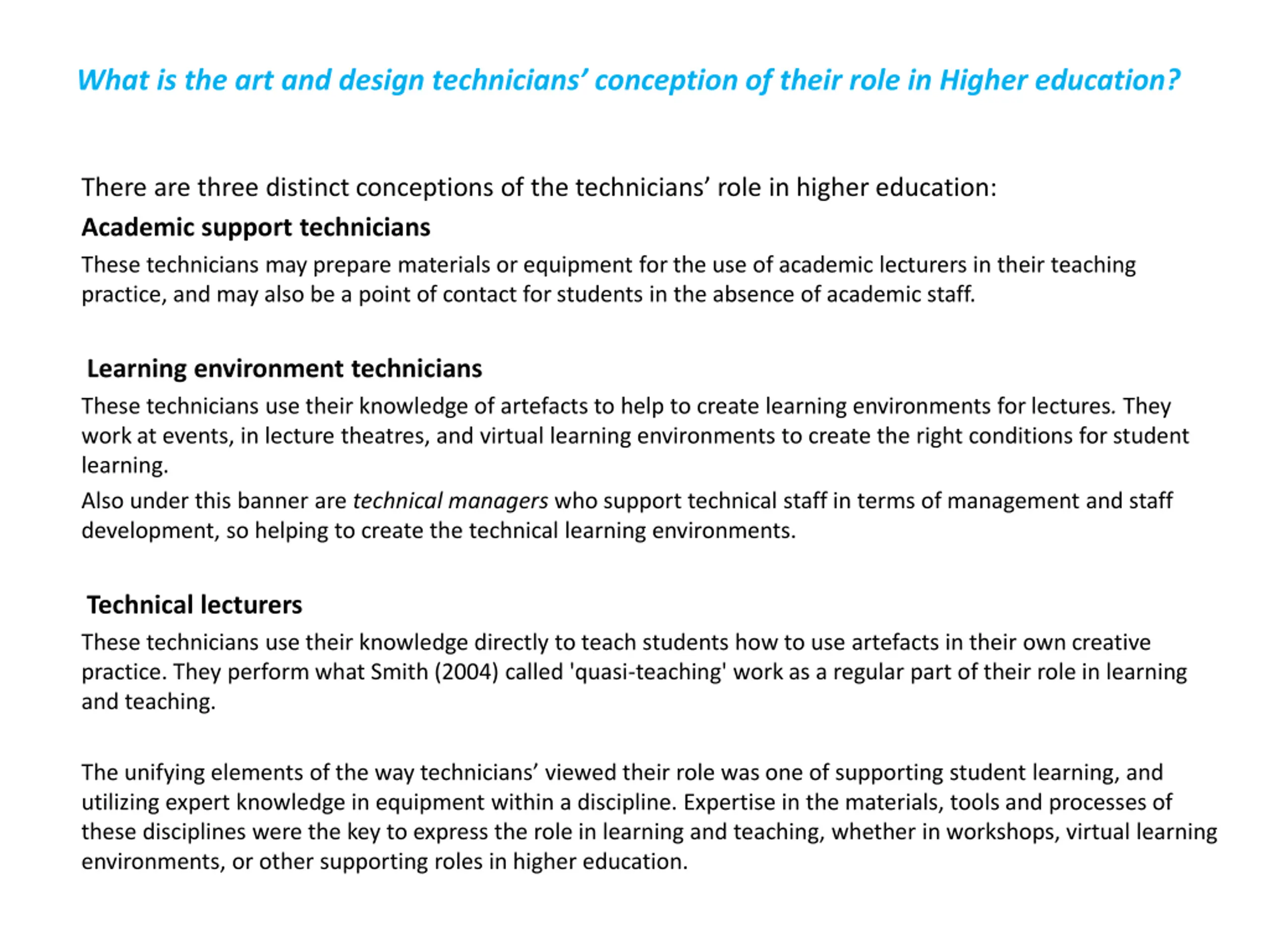 What is the art and design technicians conception of their role in Higher education? There are three distinct conceptions of the technicians role in higher education: Academic support technicians These technicians may prepare materials or equipment for the use of academic lecturers in their teaching practice, and may also be a point of contact for students in the absence of academic staff. Learning environment technicians These technicians use their knowledge of artefacts to help to create learning environments for lectures. They work at events, in lecture theatres, and virtual learning environments to create the right conditions for student learning. Also under this banner are technical managers who support technical staff in terms of management and staff development, so helping to create the technical learning environments. Technical lecturers These technicians use their knowledge directly to teach students how to use artefacts in their own creative practice. They perform what Smith (2004) called 'quasi-teaching' work as a regular part of their role in learning and teaching. The unifying elements of the way technicians viewed their role was one of supporting student learning, and utilizing expert knowledge in equipment within a discipline. Expertise in the materials, tools and processes of these disciplines were the key to express the role in learning and teaching, whether in workshops, virtual learning environments, or other supporting roles in higher education.