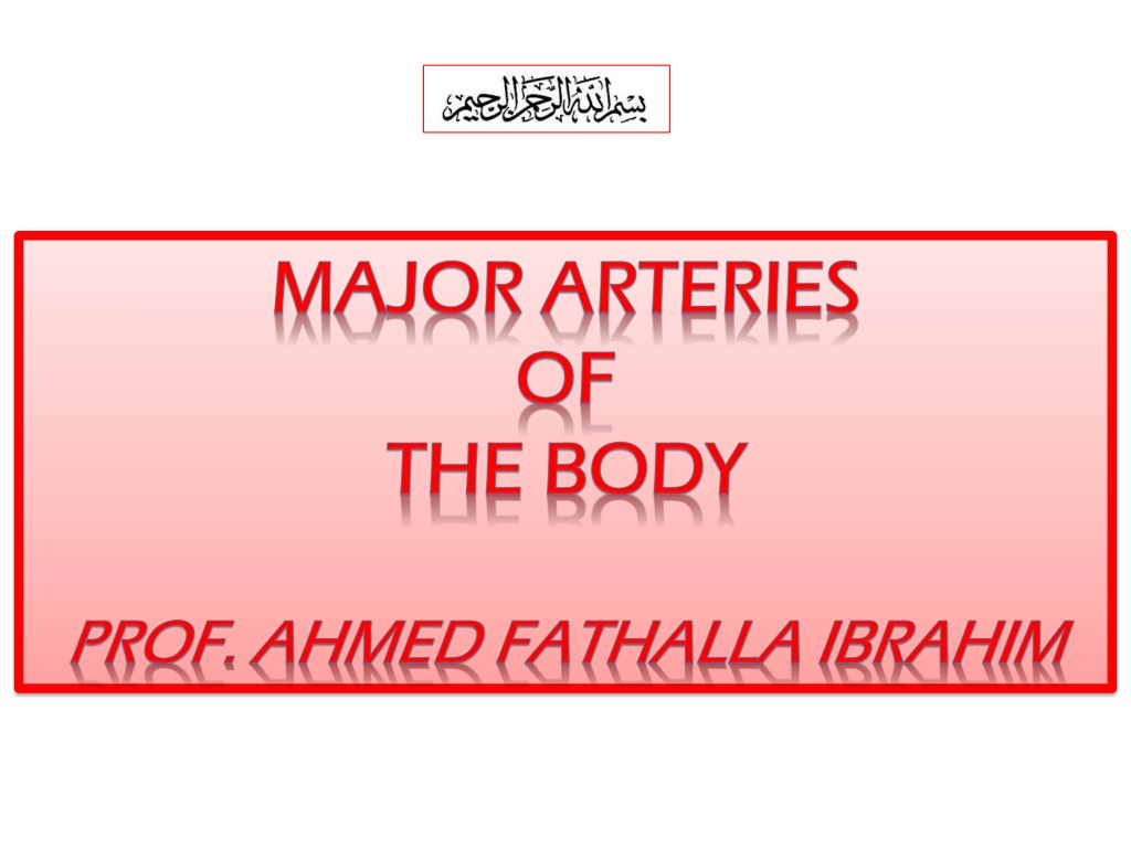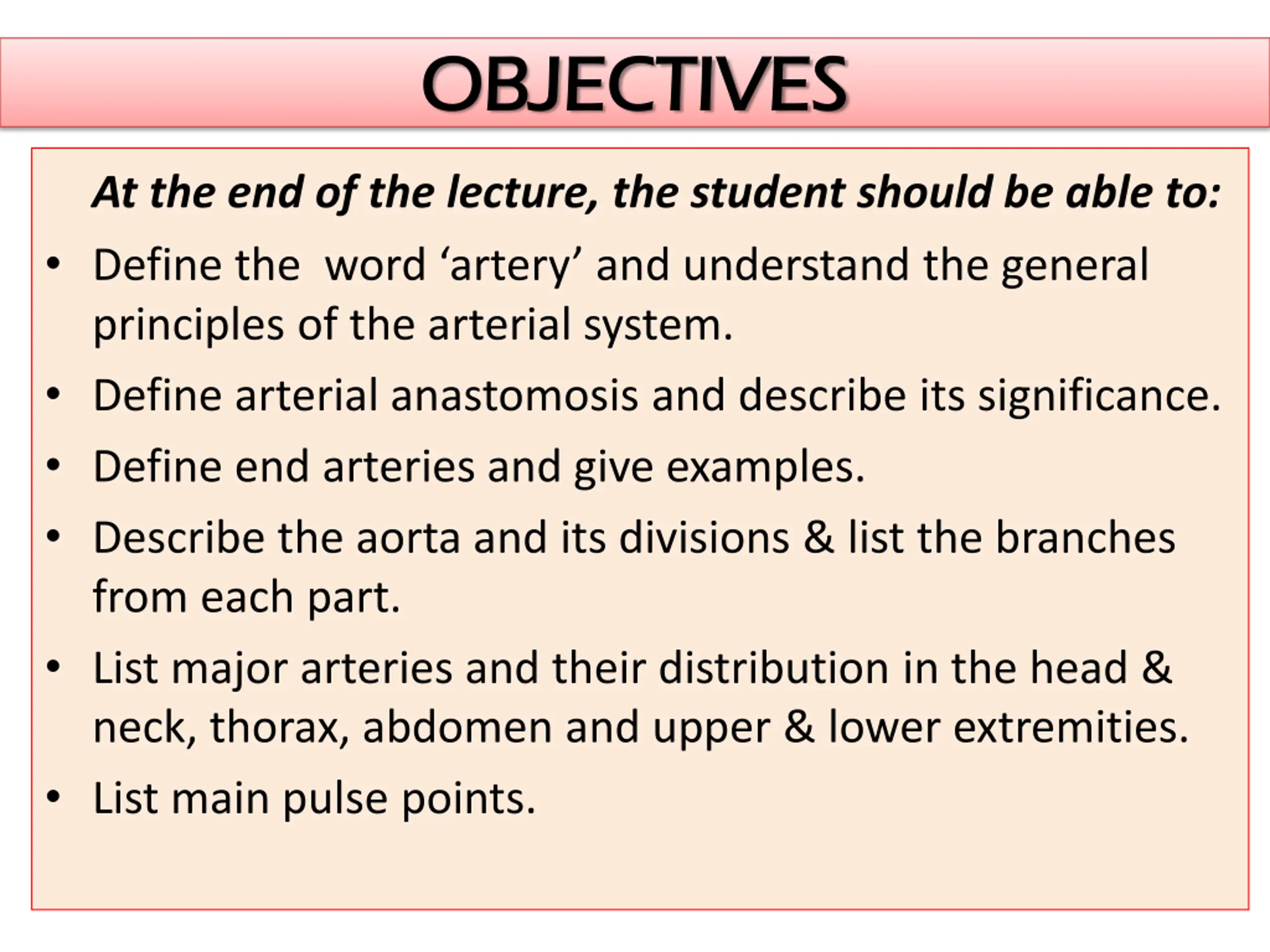 OBJECTIVES OBJECTIVES At the end of the lecture, the student should be able to: Define the word artery and understand the general principles of the arterial system. Define arterial anastomosis and describe its significance. Define end arteries and give examples. Describe the aorta and its divisions & list the branches from each part. List major arteries and their distribution in the head & neck, thorax, abdomen and upper & lower extremities. List main pulse points.
