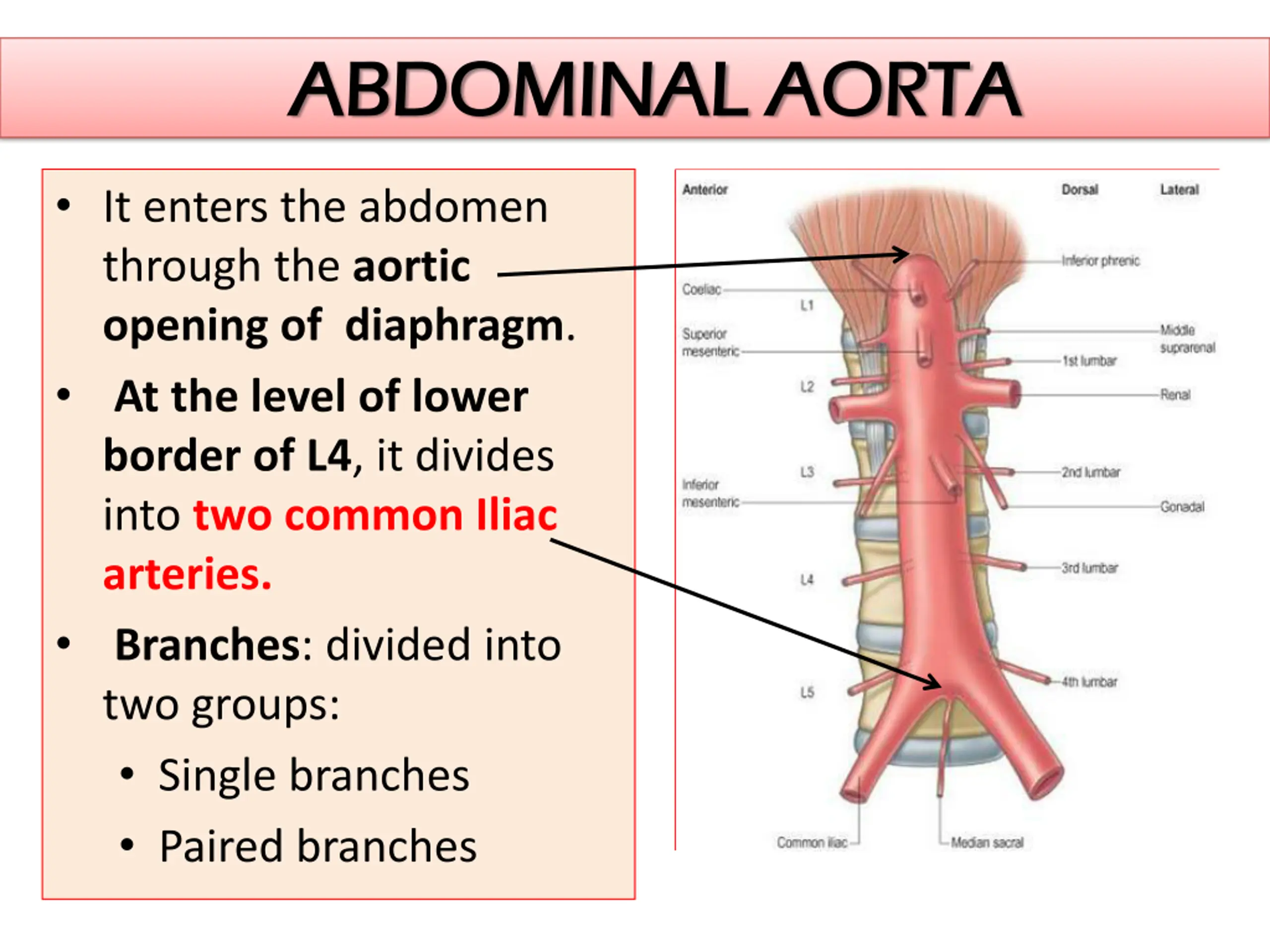 ABDOMINAL AORTA ABDOMINAL AORTA It enters the abdomen through the aortic opening of diaphragm. At the level of lower border of L4, it divides into two common Iliac arteries. Branches: divided into two groups: Single branches Paired branches