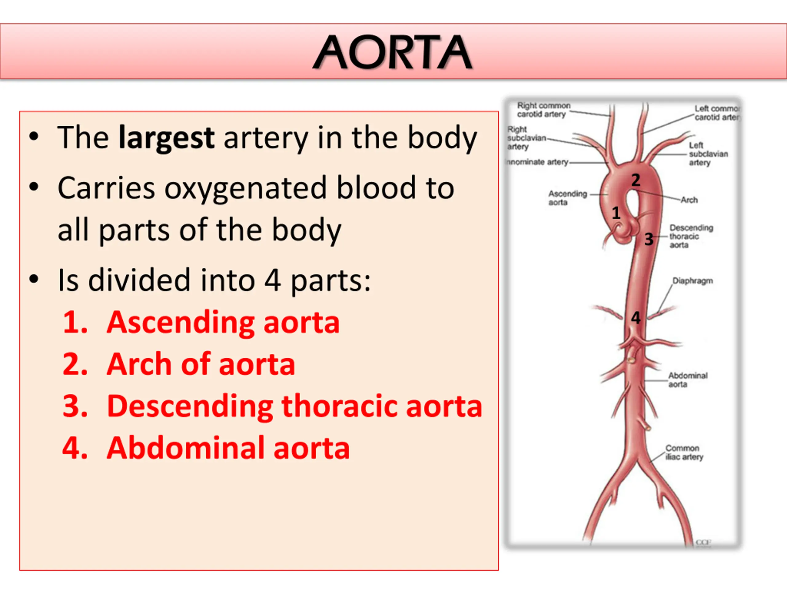 AORTA AORTA The largest artery in the body Carries oxygenated blood to all parts of the body Is divided into 4 parts: 1. Ascending aorta 2. Arch of aorta 3. Descending thoracic aorta 4. Abdominal aorta 2 1 3 4
