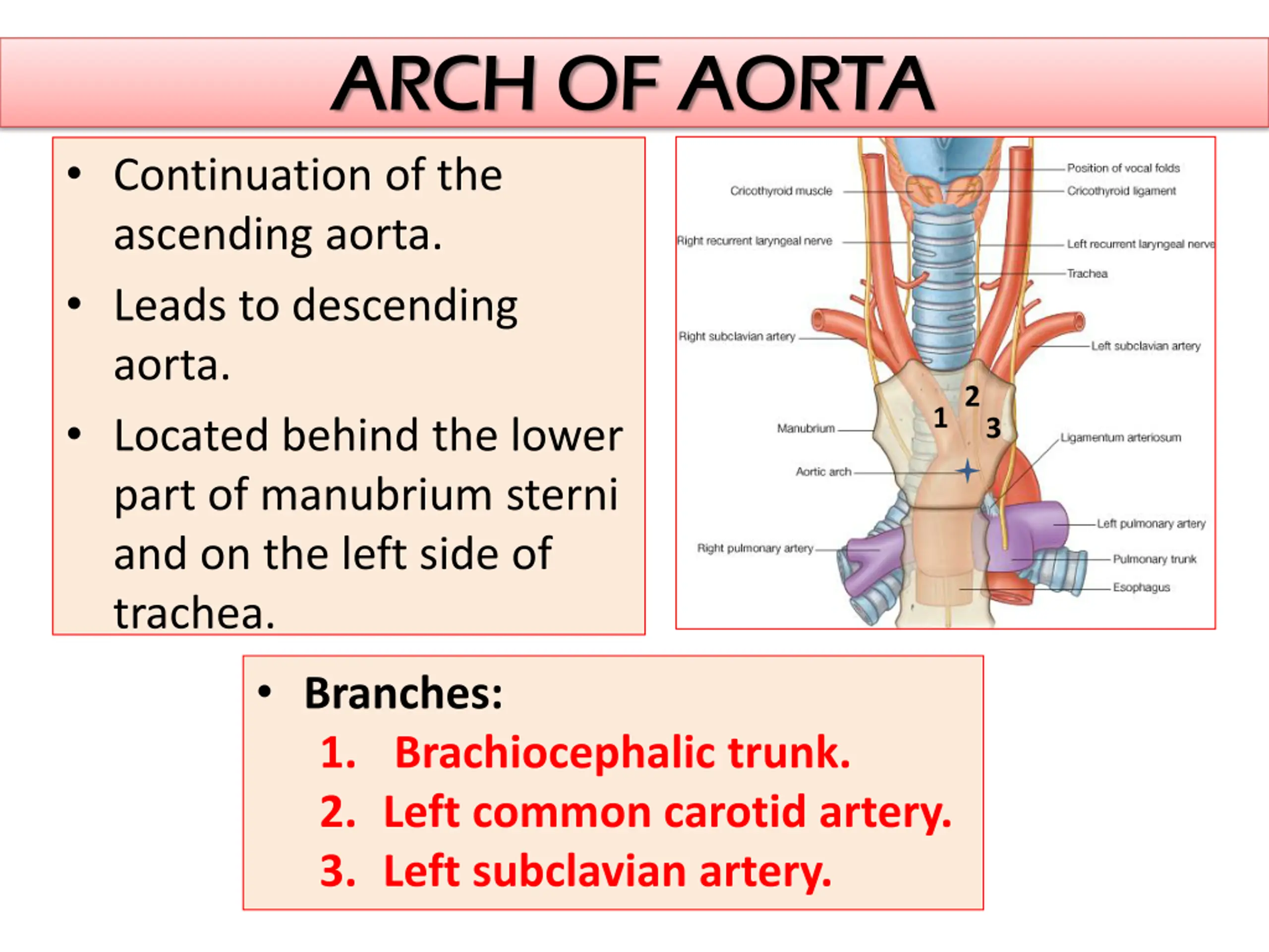 ARCH OF AORTA ARCH OF AORTA Continuation of the ascending aorta. Leads to descending aorta. Located behind the lower part of manubrium sterni and on the left side of trachea. Branches: 1. Brachiocephalic trunk. 2. Left common carotid artery. 3. Left subclavian artery. 12 3