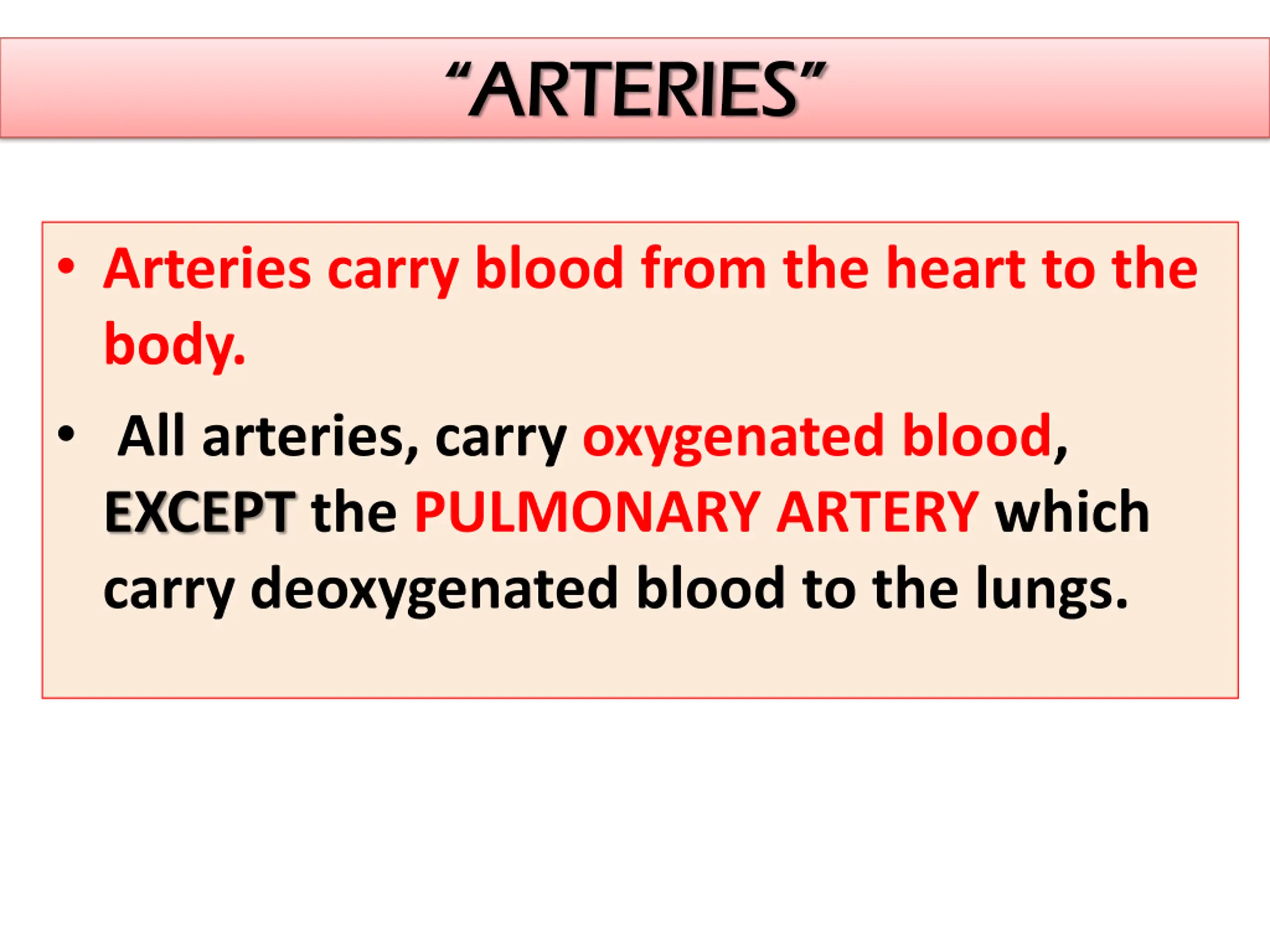 ARTERIES ARTERIES Arteries carry blood from the heart to the body. All arteries, carry oxygenated blood, EXCEPT the PULMONARY ARTERY which carry deoxygenated blood to the lungs.