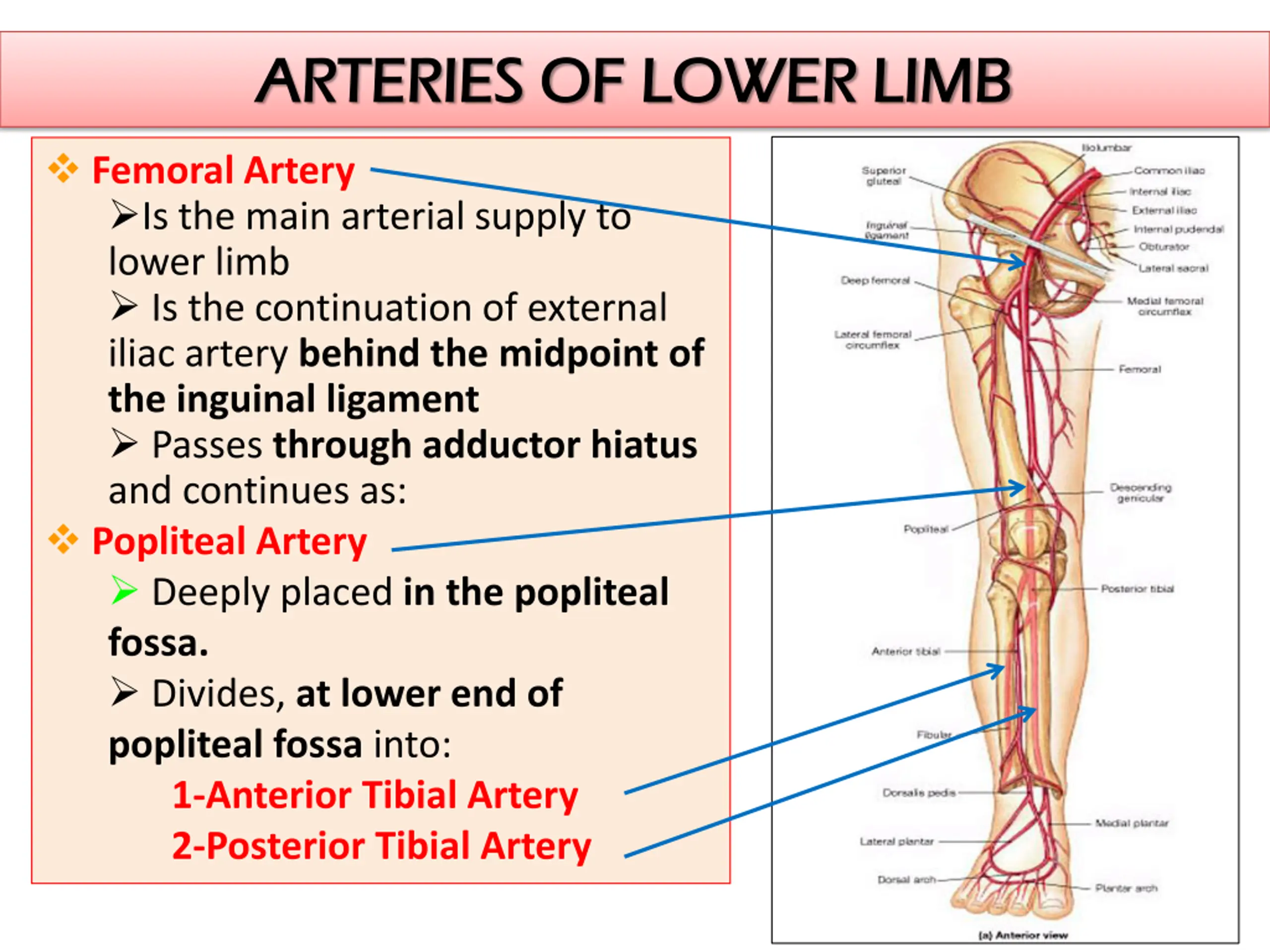 ARTERIES OF LOWER LIMB ARTERIES OF LOWER LIMB Femoral Artery Is the main arterial supply to lower limb Is the continuation of external iliac artery behind the midpoint of the inguinal ligament Passes through adductor hiatus and continues as: Popliteal Artery Deeply placed in the popliteal fossa. Divides, at lower end of popliteal fossa into: 1-Anterior Tibial Artery 2-Posterior Tibial Artery