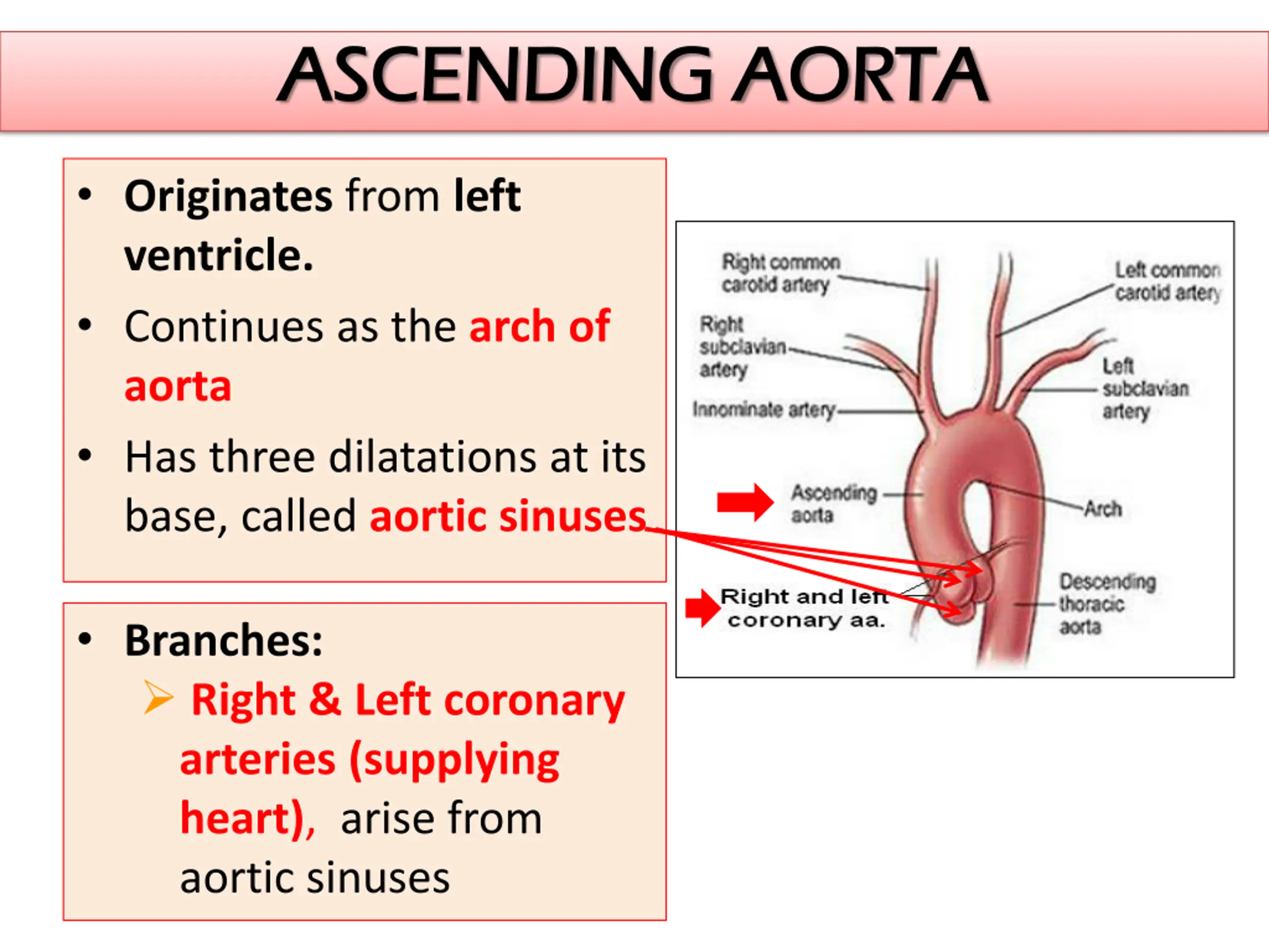 ASCENDING AORTA ASCENDING AORTA Originates from left ventricle. Continues as the arch of aorta Has three dilatations at its base, called aortic sinuses Branches: Right & Left coronary arteries (supplying heart), arise from aortic sinuses