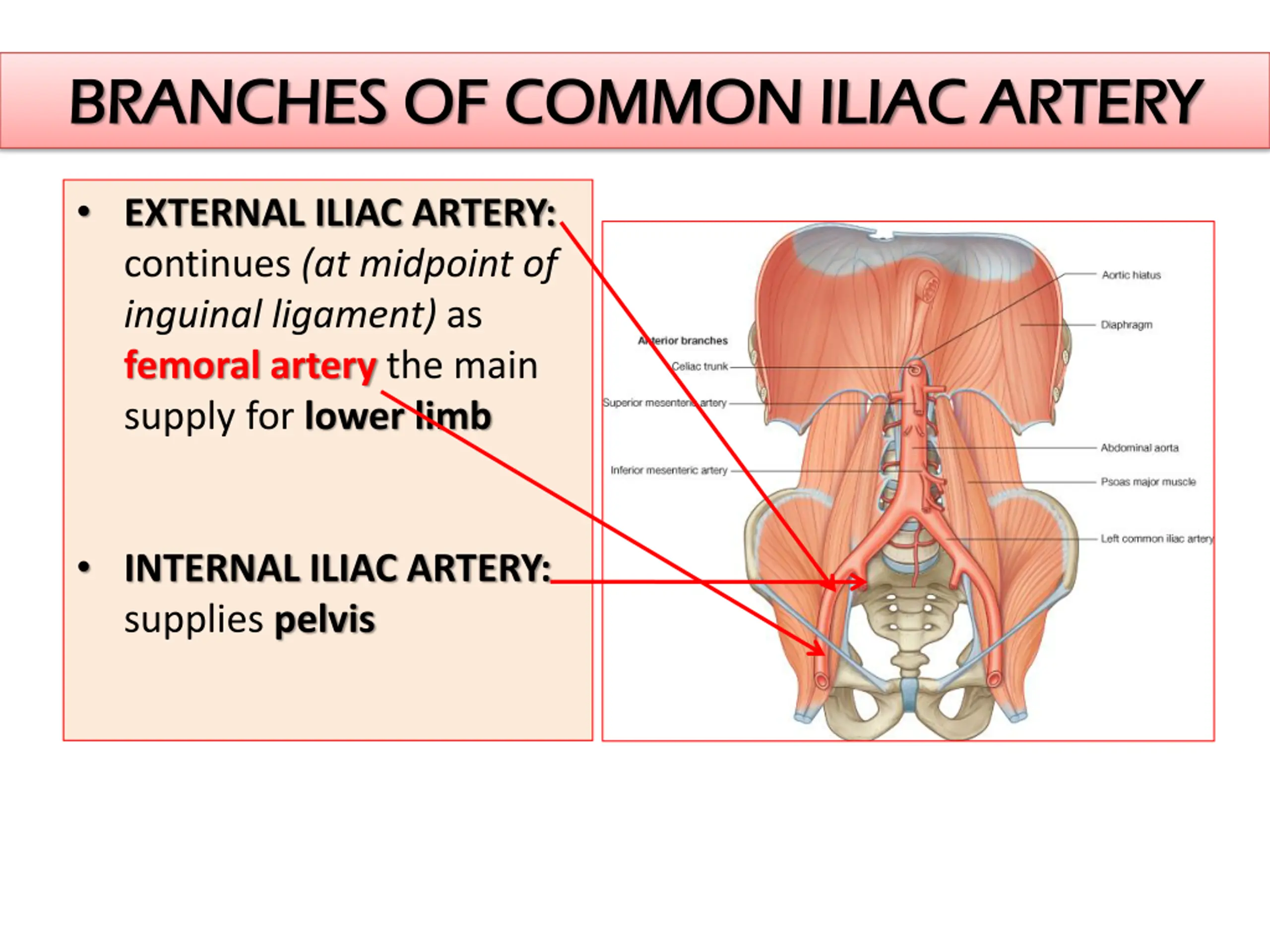 BRANCHES OF COMMON ILIAC ARTERY BRANCHES OF COMMON ILIAC ARTERY EXTERNAL ILIAC ARTERY: continues (at midpoint of inguinal ligament) as femoral artery the main supply for lower limb INTERNAL ILIAC ARTERY: supplies pelvis