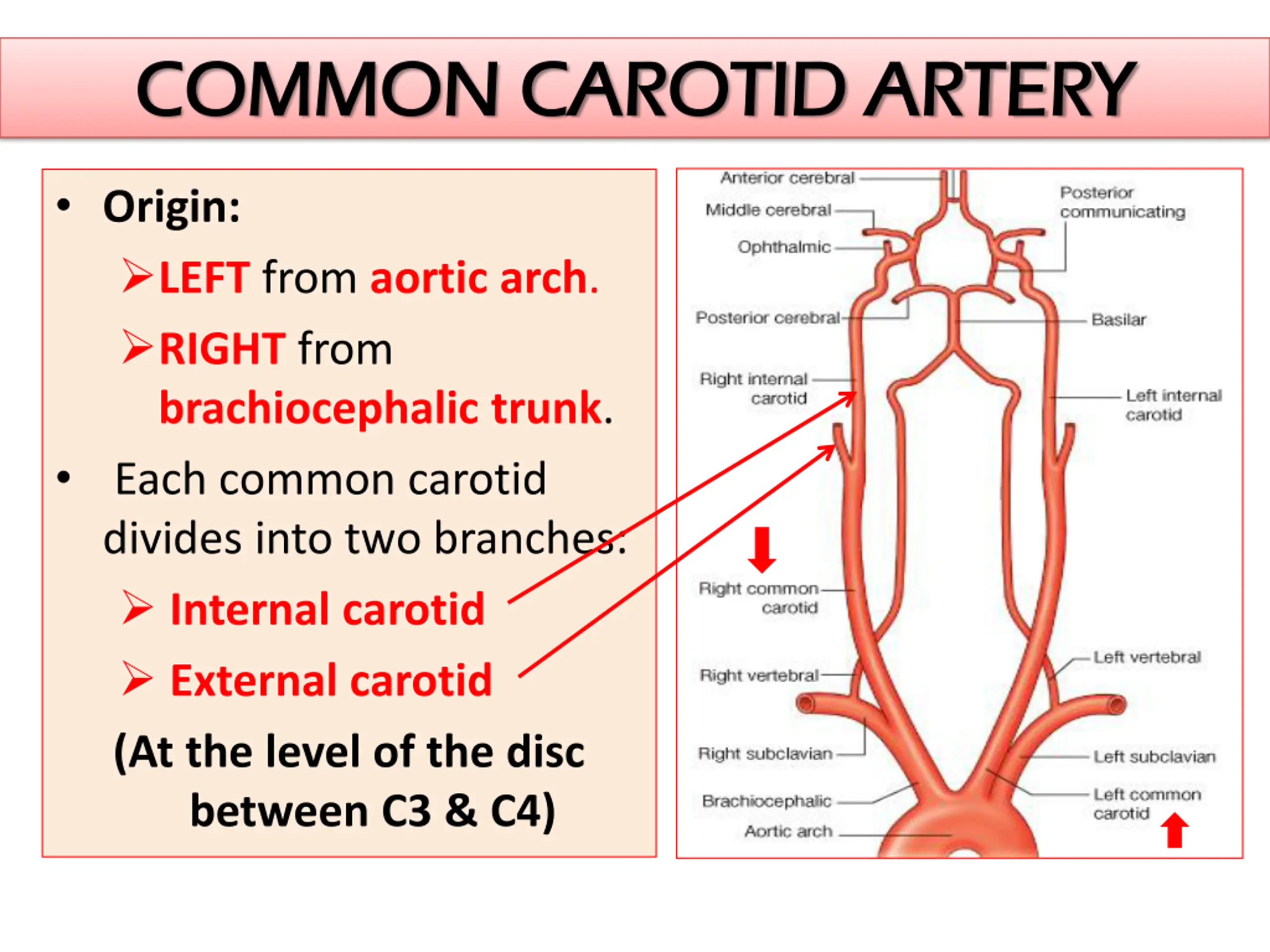 COMMON CAROTID ARTERY COMMON CAROTID ARTERY Origin: LEFT from aortic arch. RIGHT from brachiocephalic trunk. Each common carotid divides into two branches: Internal carotid External carotid (At the level of the disc between C3 & C4)