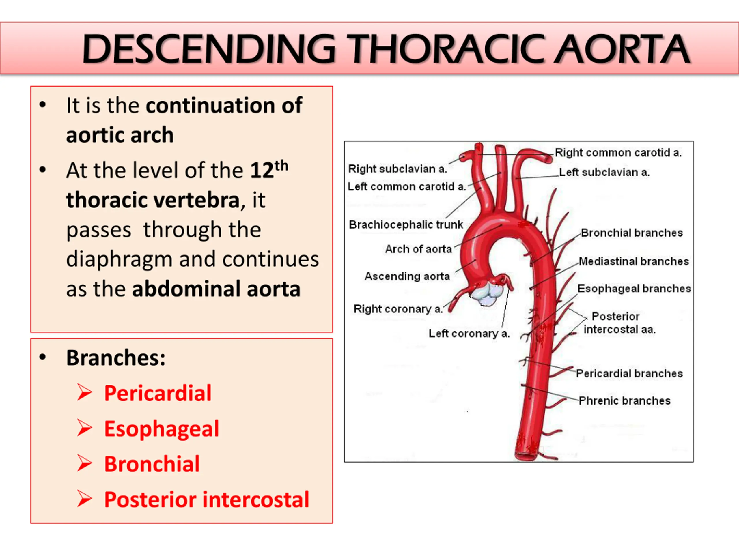 DESCENDING THORACIC AORTA DESCENDING THORACIC AORTA It is the continuation of aortic arch At the level of the 12th thoracic vertebra, it passes through the diaphragm and continues as the abdominal aorta Branches: Pericardial Esophageal Bronchial Posterior intercostal