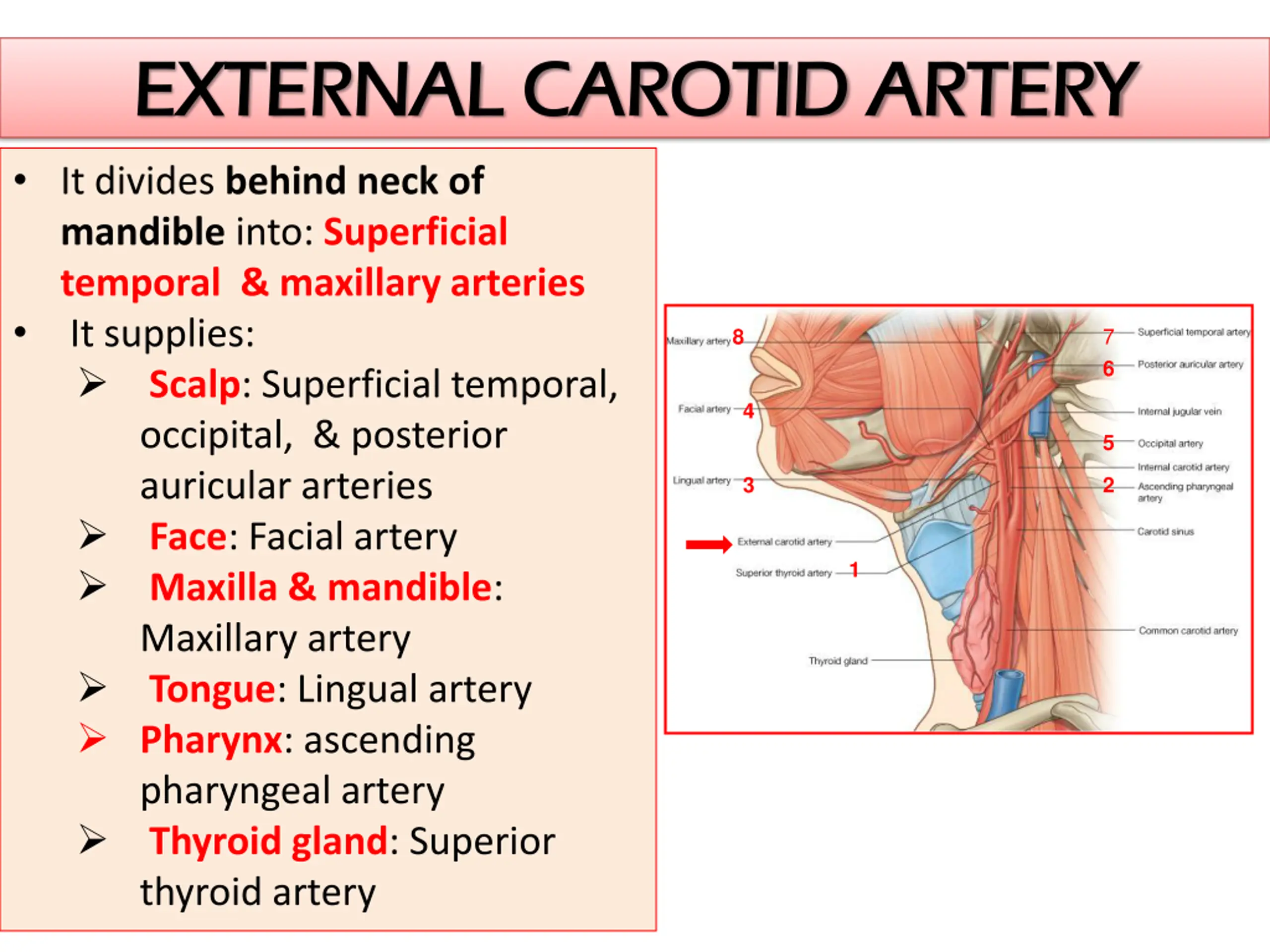 EXTERNAL CAROTID ARTERY EXTERNAL CAROTID ARTERY It divides behind neck of mandible into: Superficial temporal & maxillary arteries It supplies: Scalp: Superficial temporal, occipital, & posterior auricular arteries Face: Facial artery Maxilla & mandible: Maxillary artery Tongue: Lingual artery Pharynx: ascending pharyngeal artery Thyroid gland: Superior thyroid artery 7 8 6 4 5 3 2 1