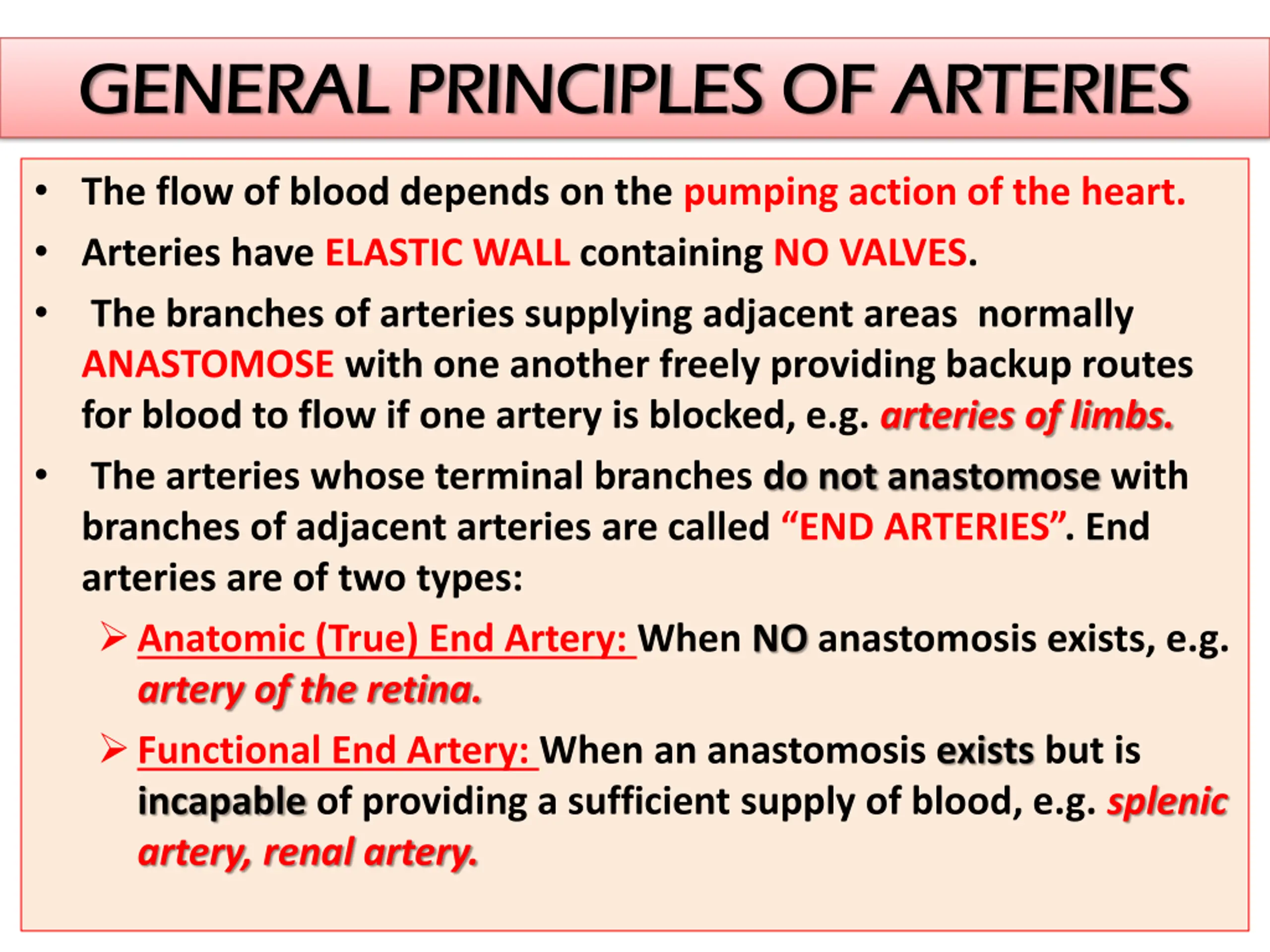 GENERAL PRINCIPLES OF ARTERIES GENERAL PRINCIPLES OF ARTERIES The flow of blood depends on the pumping action of the heart. Arteries have ELASTIC WALL containing NO VALVES. The branches of arteries supplying adjacent areas normally ANASTOMOSE with one another freely providing backup routes for blood to flow if one artery is blocked, e.g. arteries of limbs. The arteries whose terminal branches do not anastomose with branches of adjacent arteries are called END ARTERIES . End arteries are of two types: Anatomic (True) End Artery: When NO anastomosis exists, e.g. artery of the retina. Functional End Artery: When an anastomosis exists but is incapable of providing a sufficient supply of blood, e.g. splenic artery, renal artery.