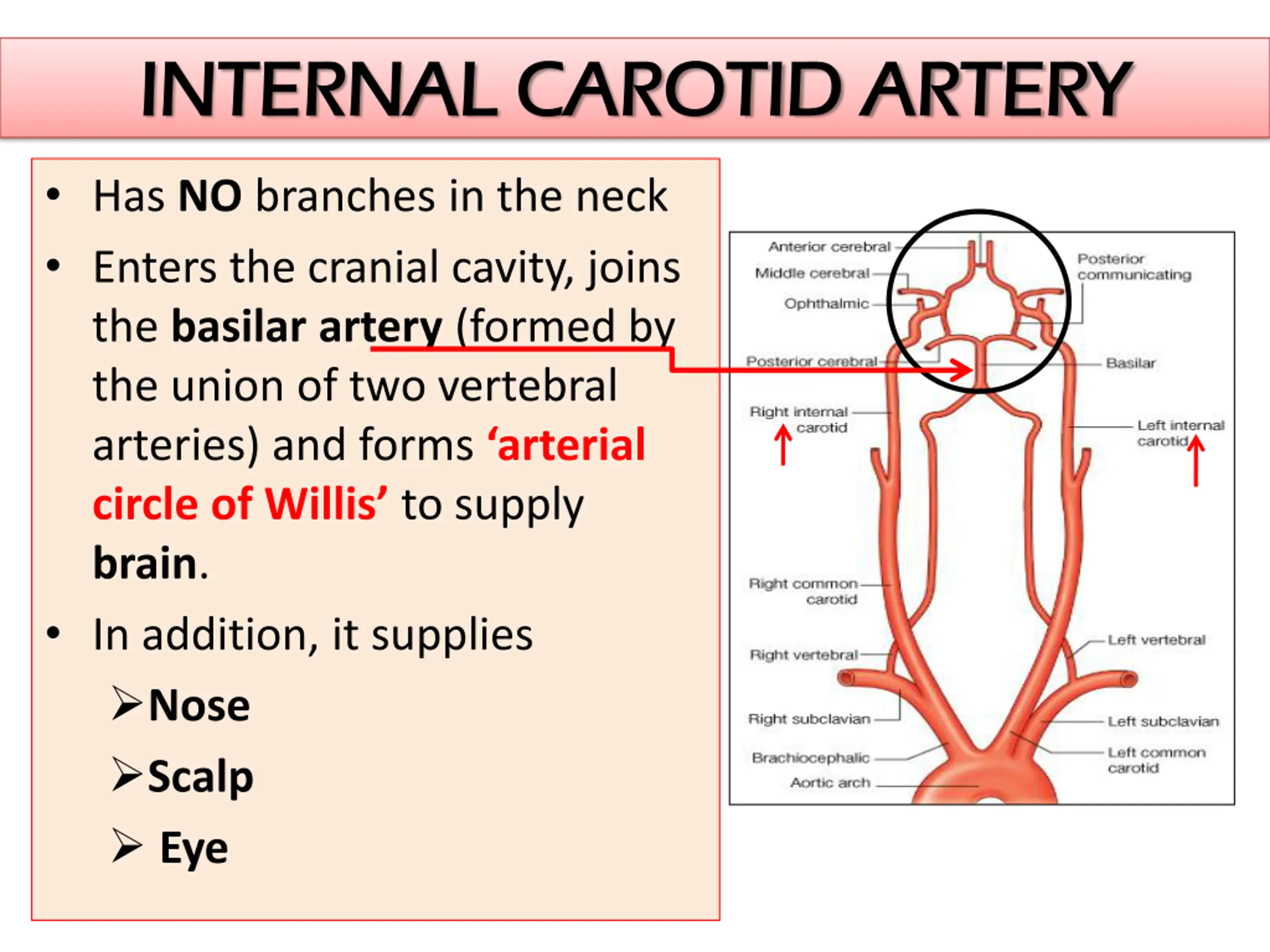 INTERNAL CAROTID ARTERY INTERNAL CAROTID ARTERY Has NO branches in the neck Enters the cranial cavity, joins the basilar artery (formed by the union of two vertebral arteries) and forms arterial circle of Willis to supply brain. In addition, it supplies Nose Scalp Eye