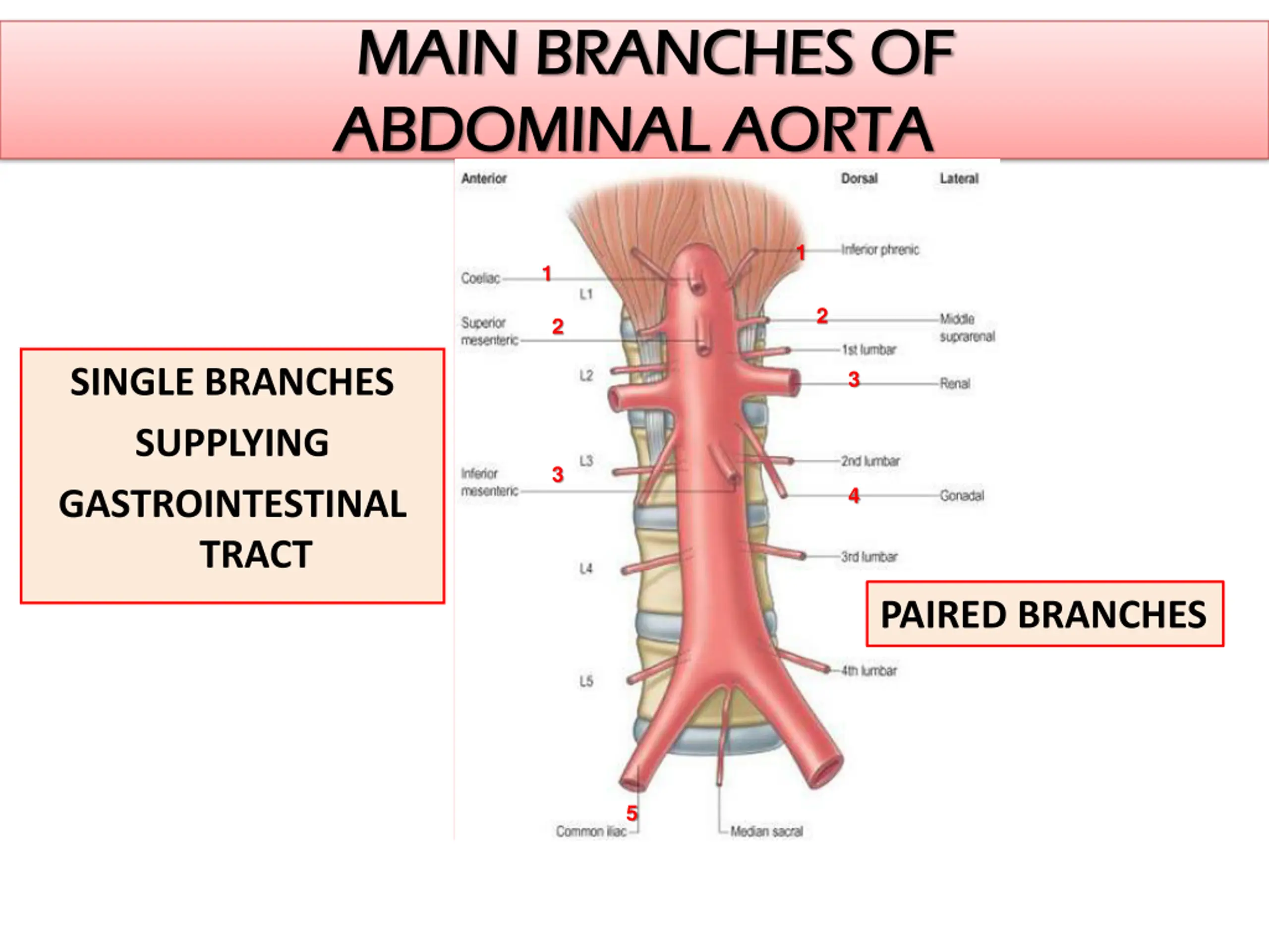 MAIN BRANCHES OF MAIN BRANCHES OF ABDOMINAL AORTA ABDOMINAL AORTA 1 1 2 2 SINGLE BRANCHES SUPPLYING GASTROINTESTINAL TRACT 3 3 4 PAIRED BRANCHES 5