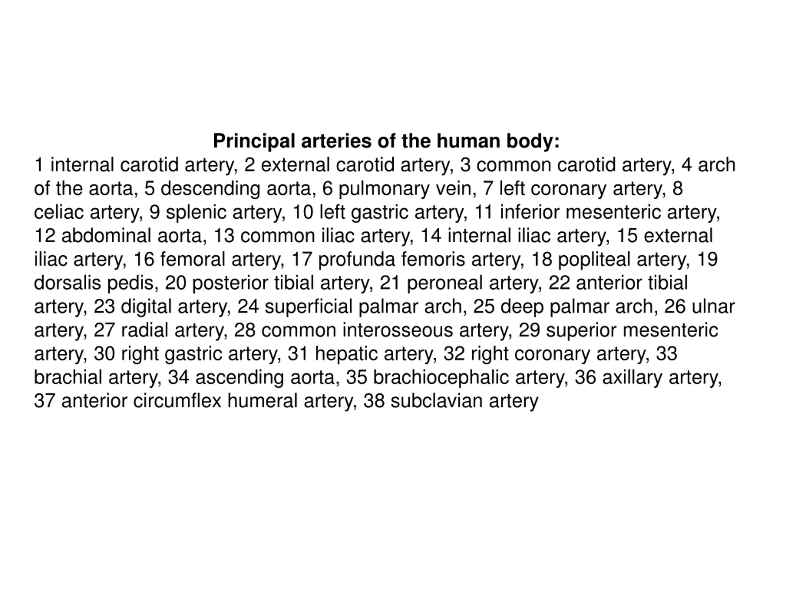 Principal arteries of the human body: 1 internal carotid artery, 2 external carotid artery, 3 common carotid artery, 4 arch of the aorta, 5 descending aorta, 6 pulmonary vein, 7 left coronary artery, 8 celiac artery, 9 splenic artery, 10 left gastric artery, 11 inferior mesenteric artery, 12 abdominal aorta, 13 common iliac artery, 14 internal iliac artery, 15 external iliac artery, 16 femoral artery, 17 profunda femoris artery, 18 popliteal artery, 19 dorsalis pedis, 20 posterior tibial artery, 21 peroneal artery, 22 anterior tibial artery, 23 digital artery, 24 superficial palmar arch, 25 deep palmar arch, 26 ulnar artery, 27 radial artery, 28 common interosseous artery, 29 superior mesenteric artery, 30 right gastric artery, 31 hepatic artery, 32 right coronary artery, 33 brachial artery, 34 ascending aorta, 35 brachiocephalic artery, 36 axillary artery, 37 anterior circumflex humeral artery, 38 subclavian artery