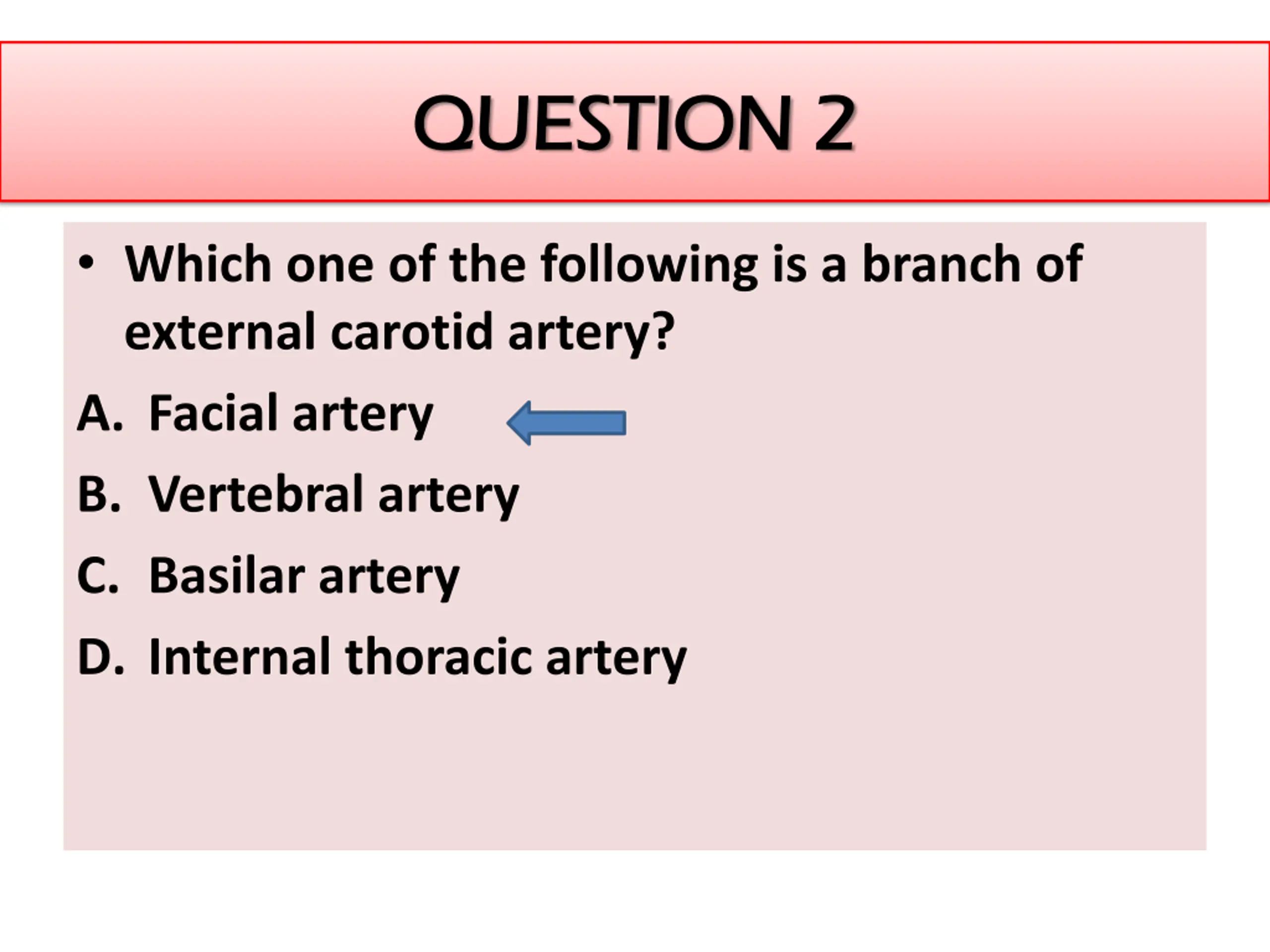 QUESTION 2 QUESTION 2 Which one of the following is a branch of external carotid artery? A. Facial artery B. Vertebral artery C. Basilar artery D. Internal thoracic artery