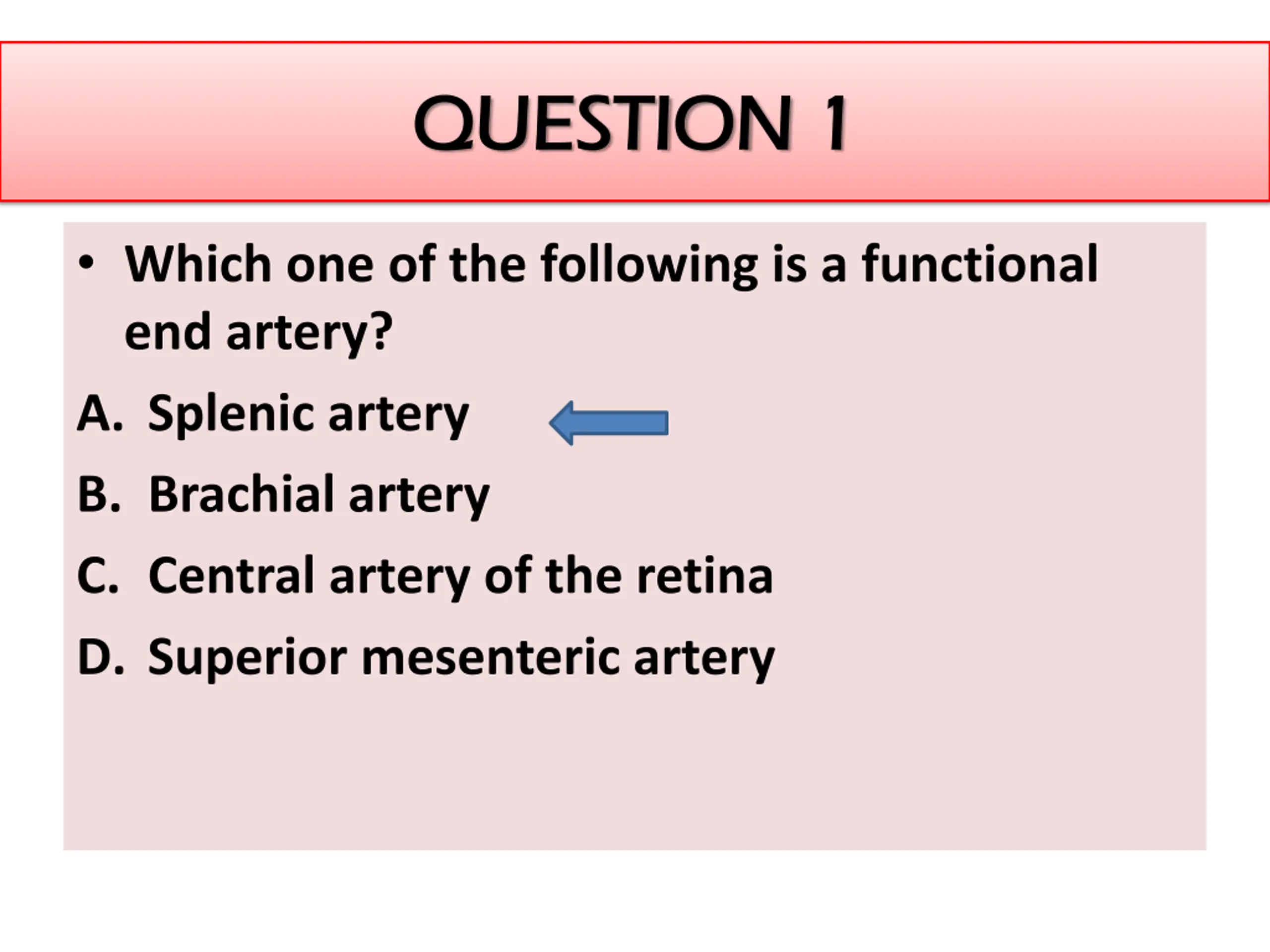 QUESTION QUESTION 1 1 Which one of the following is a functional end artery? A. Splenic artery B. Brachial artery C. Central artery of the retina D. Superior mesenteric artery