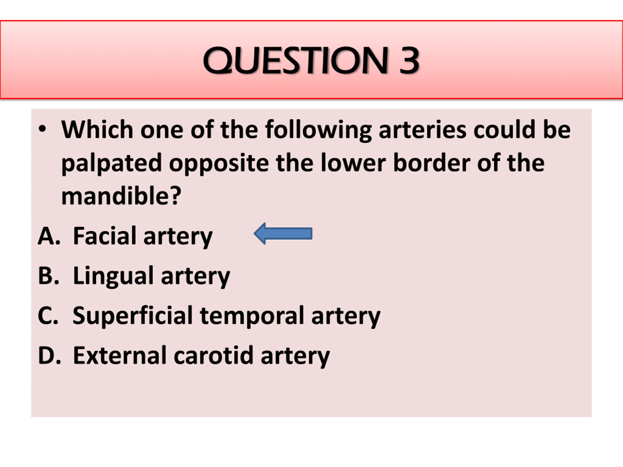 QUESTION QUESTION 3 3 Which one of the following arteries could be palpated opposite the lower border of the mandible? A. Facial artery B. Lingual artery C. Superficial temporal artery D. External carotid artery