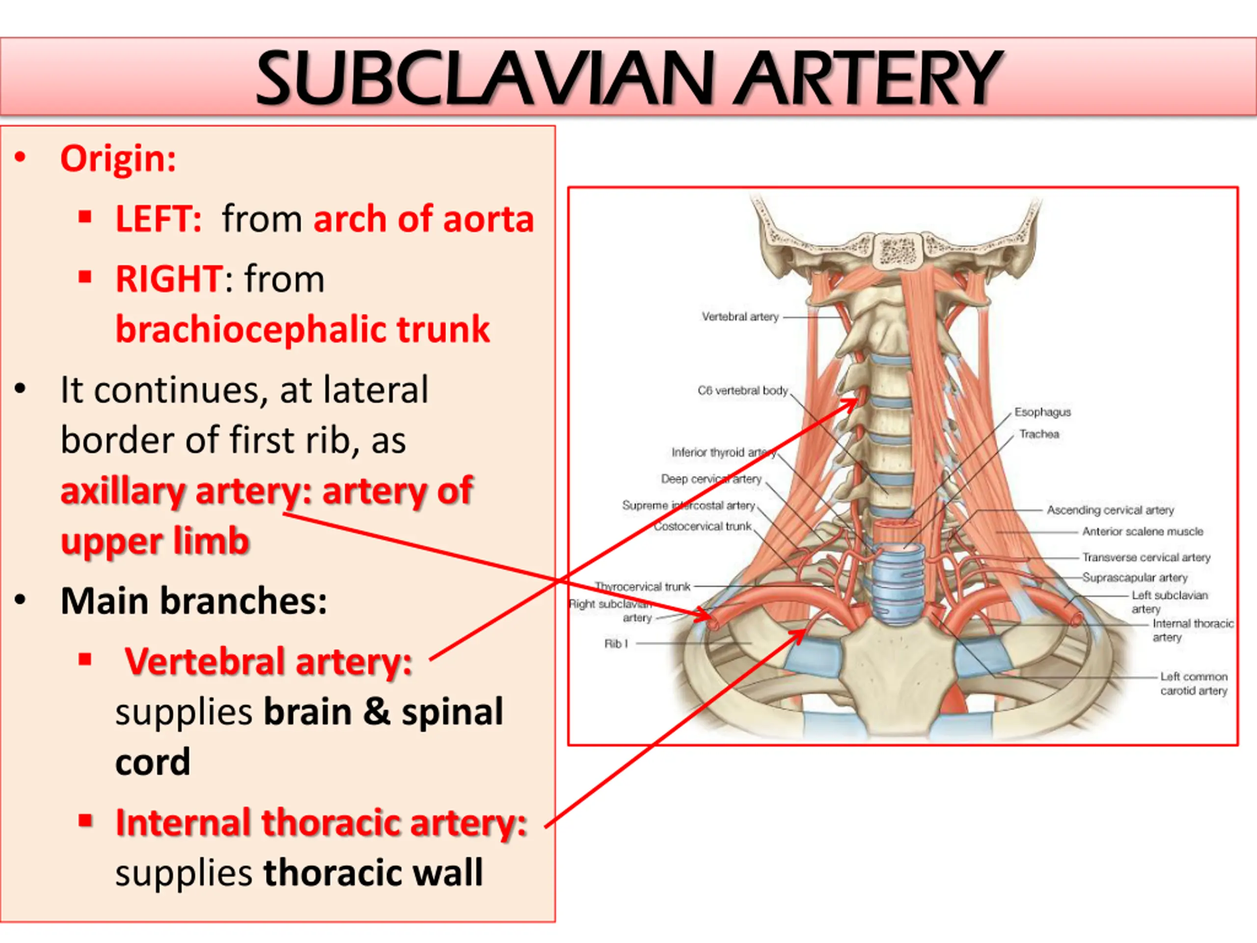 SUBCLAVIAN ARTERY SUBCLAVIAN ARTERY Origin: LEFT: from arch ofaorta RIGHT: from brachiocephalic trunk It continues, at lateral border of first rib, as axillary artery: artery of upper limb Main branches: Vertebral artery: supplies brain & spinal cord Internal thoracic artery: supplies thoracic wall