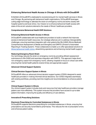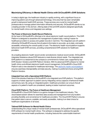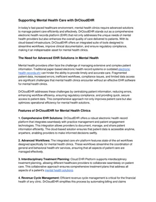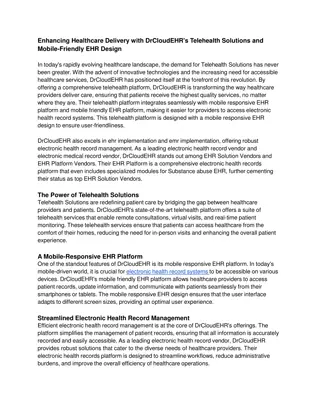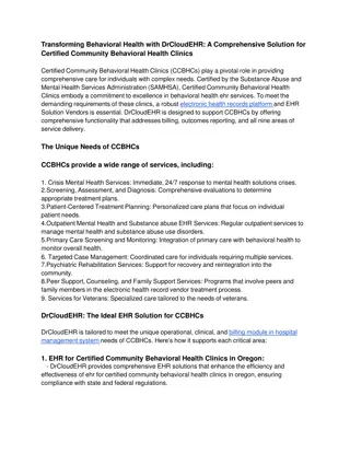 Empowering Certified Community Behavioral Health Clinics with DrCloudEHR in Oregon Certified Community Behavioral Health Clinics (CCBHCs) are at the forefront of providing comprehensive care to individuals with complex needs. These clinics, certified by the Substance Abuse and Mental Health Administration (SAMHSA), offer a wide range of services to support mental health and substance abuse treatment. However, to effectively deliver these services, Certified Community Behavioral Health Clinics require robust electronic health record in oregon (EHR) solutions that can streamline operations and enhance patient care delivery. In Oregon, community behavioural health center ehr are playing a vital role in addressing the mental health needs of the community. These clinics offer a holistic approach to care, providing services such as crisis mental health intervention, screening and assessment, patient-centered treatment planning, and outpatient healthcare electronic records and medical emr systems in oregon . Additionally, they offer primary care screening and monitoring, targeted case management, psychiatric rehabilitation services, and peer support, family support services. Tosupport the complex needs of certified community behavioral health clinics in oregon, DrCloudEHR emerges as a comprehensive electronic health record platforms in oregon tailored to meet their requirements. With its advanced features and user-friendly interface, DrCloudEHR streamlines workflows and enhances collaboration among healthcare providers. The platform offers seamless integration with third-party systems and supports interoperability, medical electronic record system in idaho, allowing ehr for certified community behavioral health clinics to exchange vital medical information securely. One of the key advantages of DrCloudEHR is its ability to support outcomes reporting and billing functionalities. A behavioral health ehr solutions in washington and idaho can easily track their performance and demonstrate their impact with built-in reporting tools. This not only helps clinics optimize their operations but also ensures compliance with regulatory requirements. As a trusted electronic health record vendor in oregon, DrCloudEHR is committed to empowering community behavioral health center ehr in oregon to deliver high-quality care to their communities. The platform's customizable workflows and multidisciplinary treatment planning capabilities enable clinics to tailor their services to meet the unique needs of each patient. By providing comprehensive documentation and real-time collaboration tools, DrCloudEHR enhances communication and coordination among healthcare providers, leading to improved patient outcomes. In addition to serving electronic medical record vendor in oregon, DrCloudEHR extends its support to other states such as Idaho and Louisiana. With its proven track record and commitment to innovation, DrCloudEHR is the preferred choice for clinics seeking to enhance their electronic health record, medical electronic record system in idaho and elevate their standards of care.