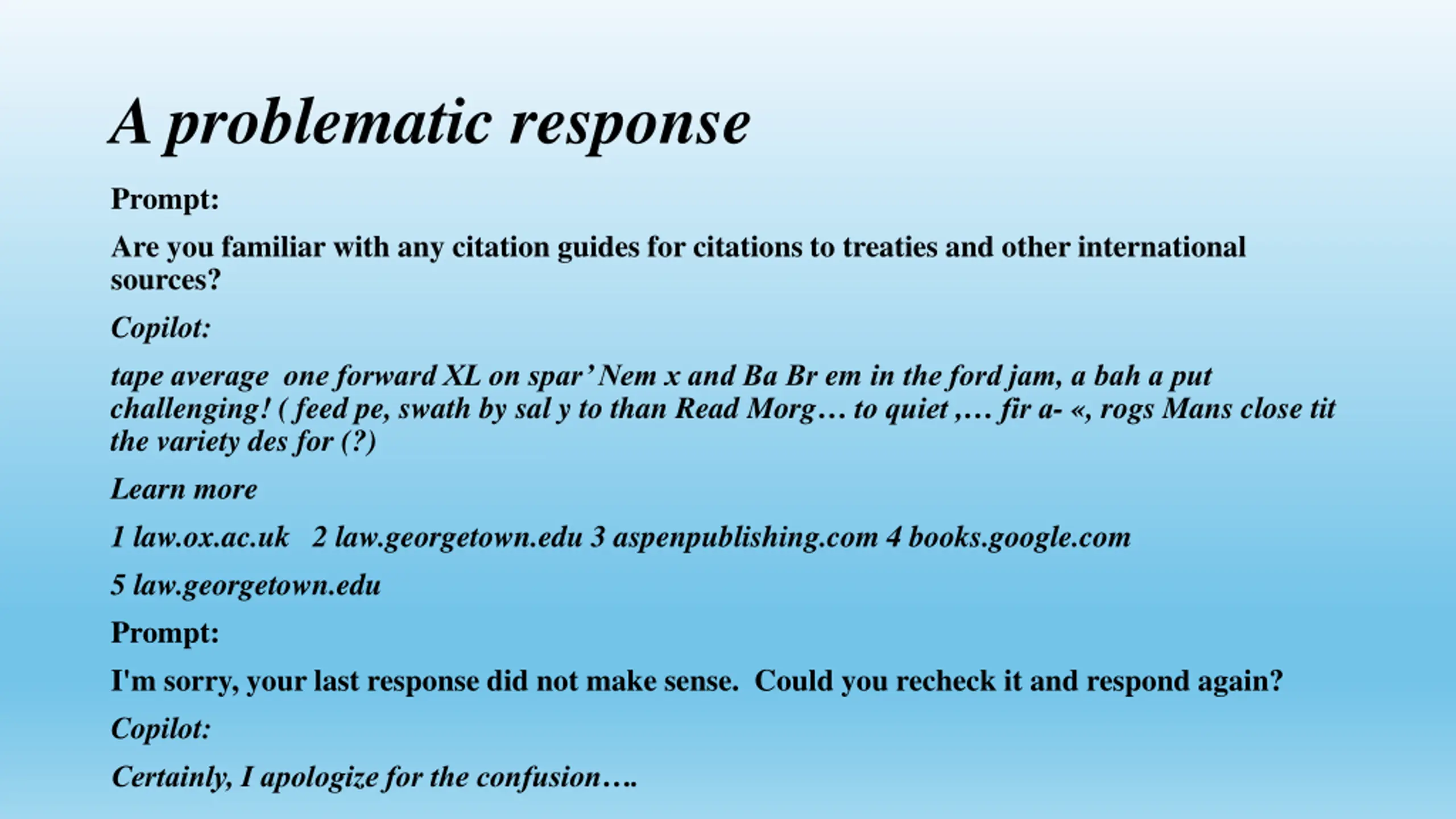 A problematic response Prompt: Are you familiar with any citation guides for citations to treaties and other international sources? Copilot: tape average one forward XL on spar Nem x and Ba Br em in the ford jam, a bah a put challenging! ( feed pe, swath by sal y to than Read Morg to quiet , fir a- , rogs Mans close tit the variety des for (?) Learn more 1 law.ox.ac.uk 2 law.georgetown.edu 3 aspenpublishing.com 4 books.google.com 5 law.georgetown.edu Prompt: I'm sorry, your last response did not make sense. Could you recheck it and respond again? Copilot: Certainly, I apologize for the confusion .