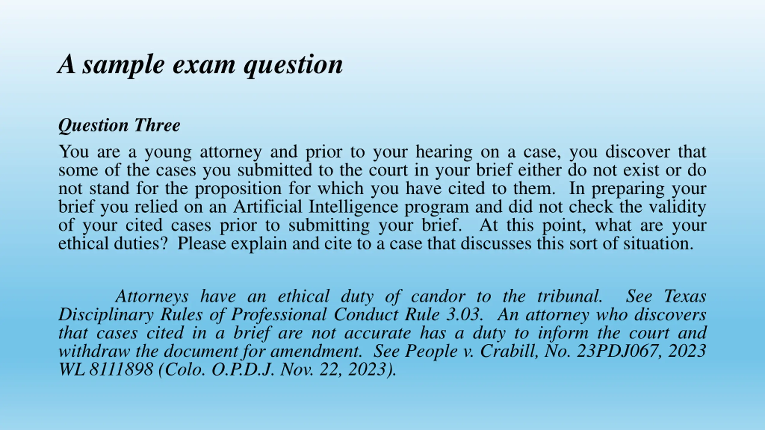 A sample exam question Question Three You are a young attorney and prior to your hearing on a case, you discover that some of the cases you submitted to the court in your brief either do not exist or do not stand for the proposition for which you have cited to them. In preparing your brief you relied on an Artificial Intelligence program and did not check the validity of your cited cases prior to submitting your brief. At this point, what are your ethical duties? Please explain and cite to a case that discusses this sort of situation. Attorneys have an ethical duty of candor to the tribunal. Disciplinary Rules of Professional Conduct Rule 3.03. An attorney who discovers that cases cited in a brief are not accurate has a duty to inform the court and withdraw the document for amendment. See People v. Crabill, No. 23PDJ067, 2023 WL 8111898 (Colo. O.P.D.J. Nov. 22, 2023). See Texas