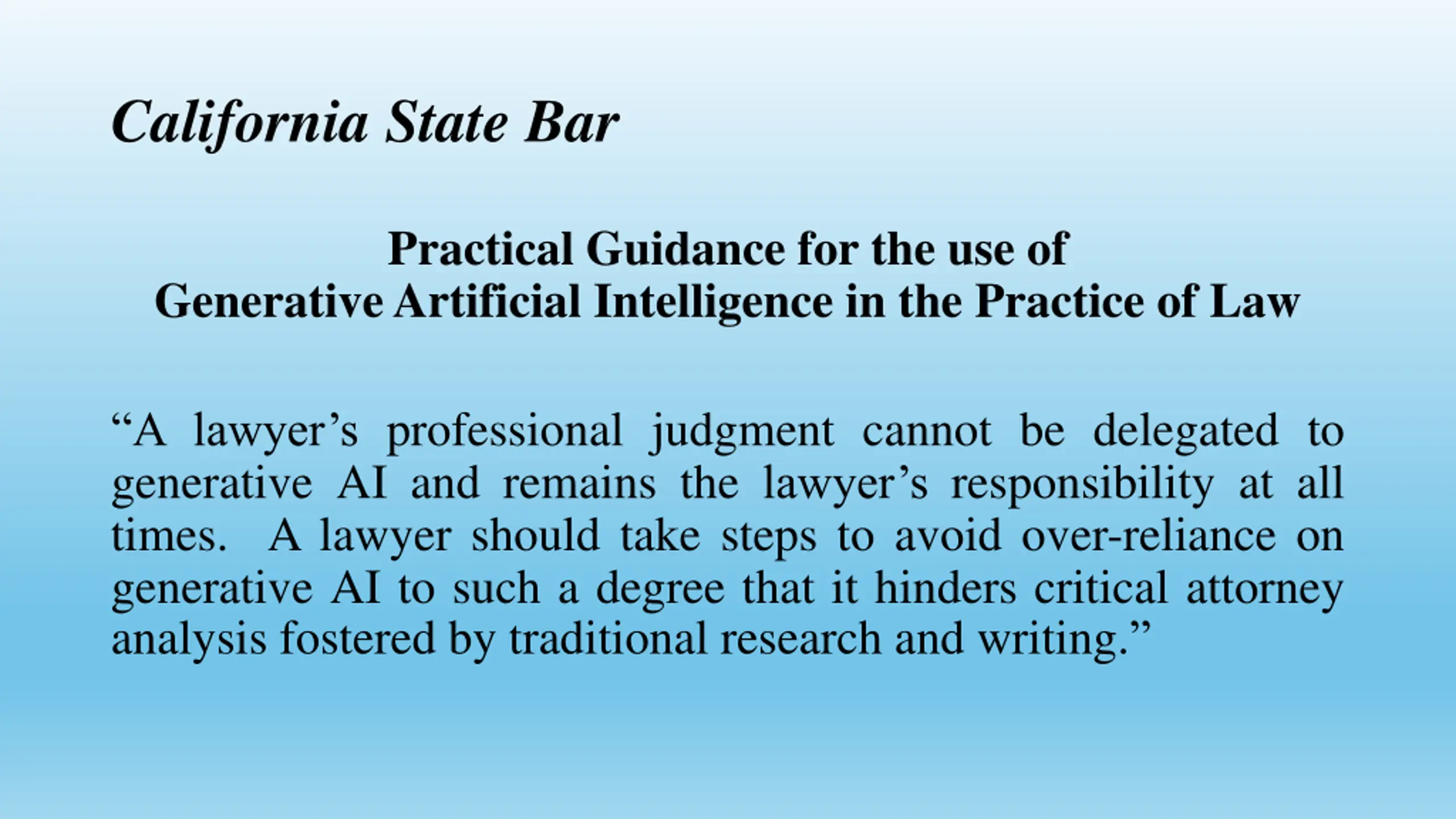 California State Bar Practical Guidance for the use of Generative Artificial Intelligence in the Practice of Law A lawyer s professional judgment cannot be delegated to generative AI and remains the lawyer s responsibility at all times. A lawyer should take steps to avoid over-reliance on generative AI to such a degree that it hinders critical attorney analysis fostered by traditional research and writing.