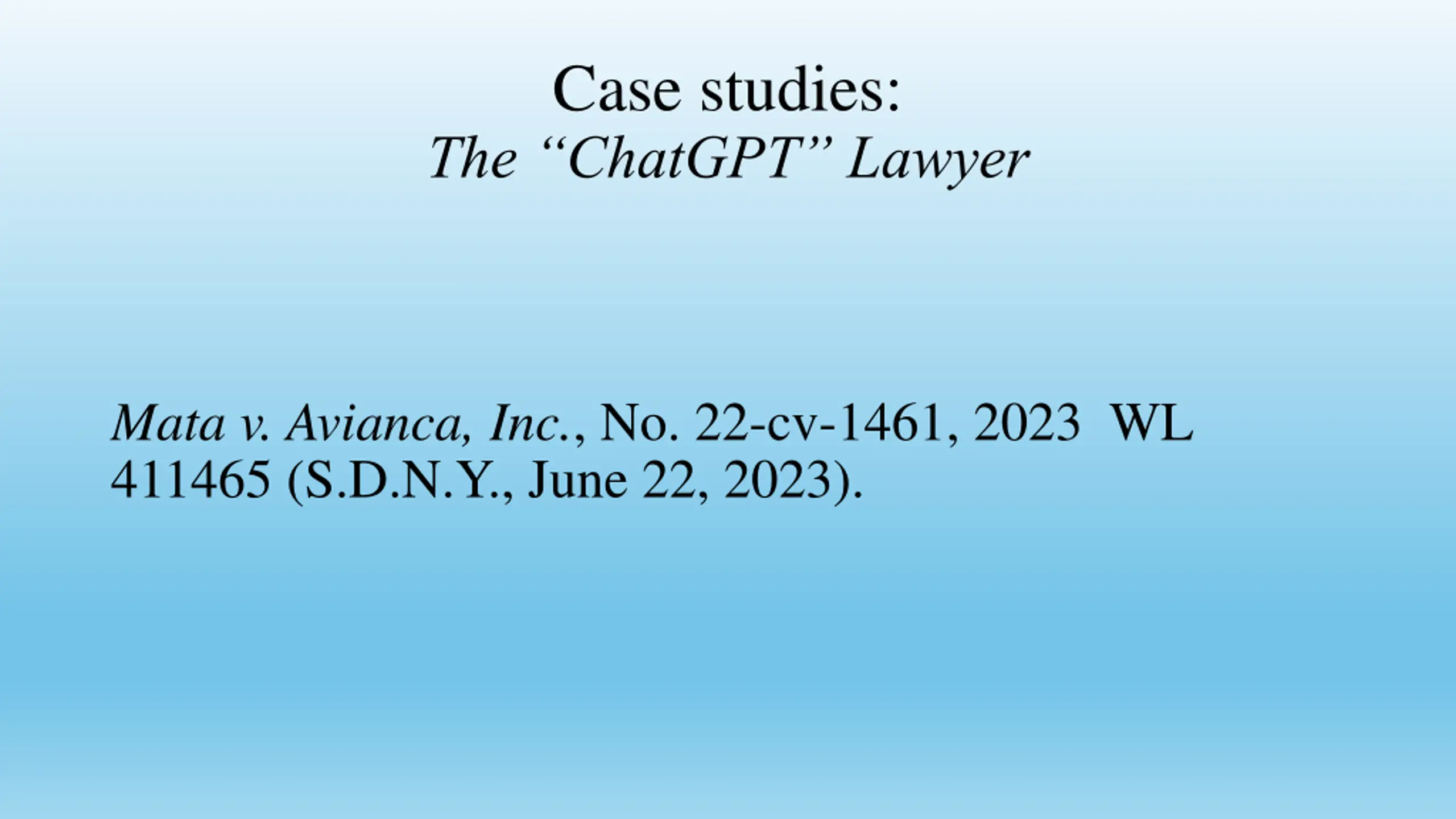 Case studies: The ChatGPT Lawyer Mata v. Avianca, Inc., No. 22-cv-1461, 2023 WL 411465 (S.D.N.Y., June 22, 2023).