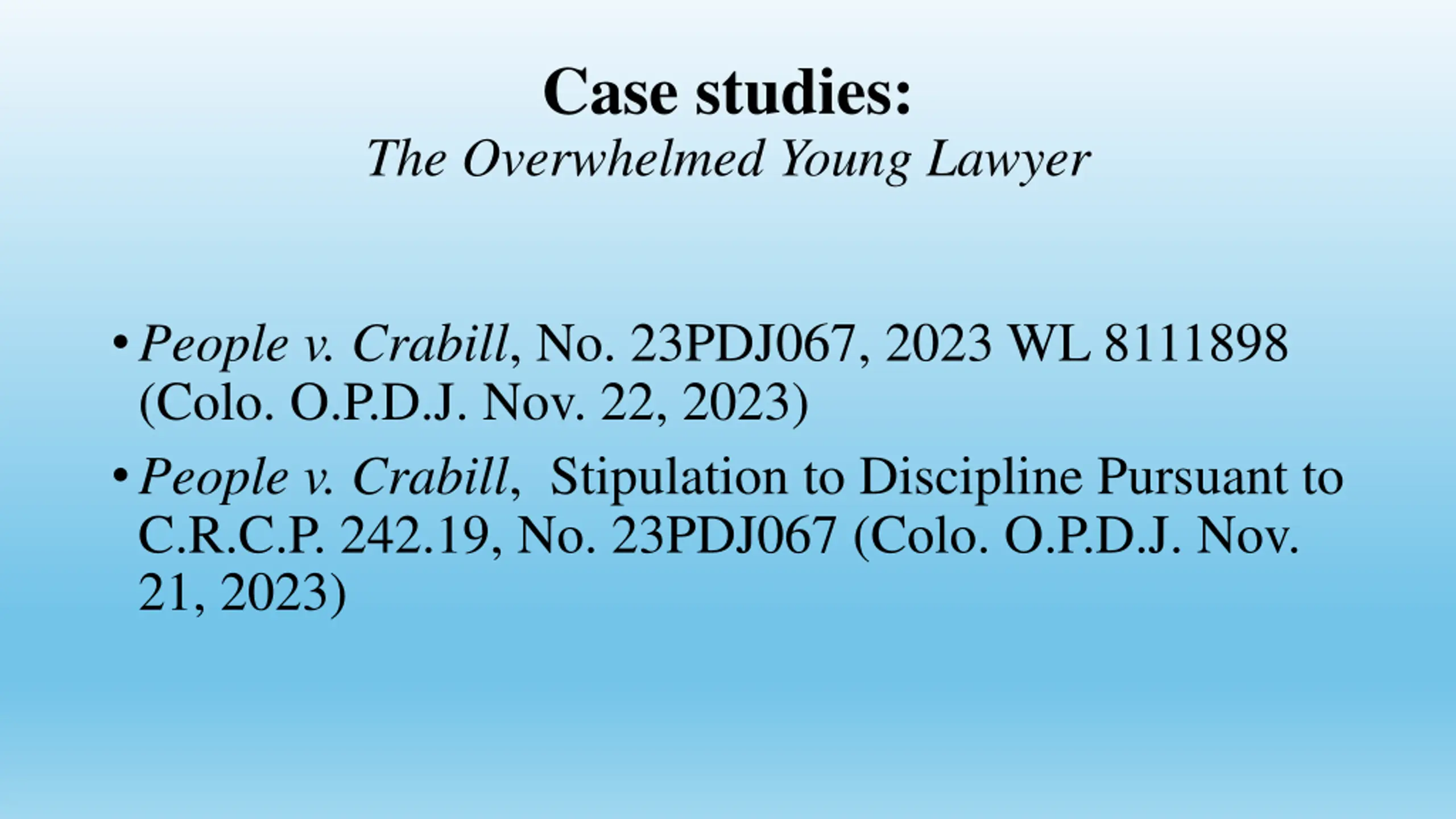 Case studies: The Overwhelmed Young Lawyer People v. Crabill, No. 23PDJ067, 2023 WL 8111898 (Colo. O.P.D.J. Nov. 22, 2023) People v. Crabill, Stipulation to Discipline Pursuant to C.R.C.P. 242.19, No. 23PDJ067 (Colo. O.P.D.J. Nov. 21, 2023)