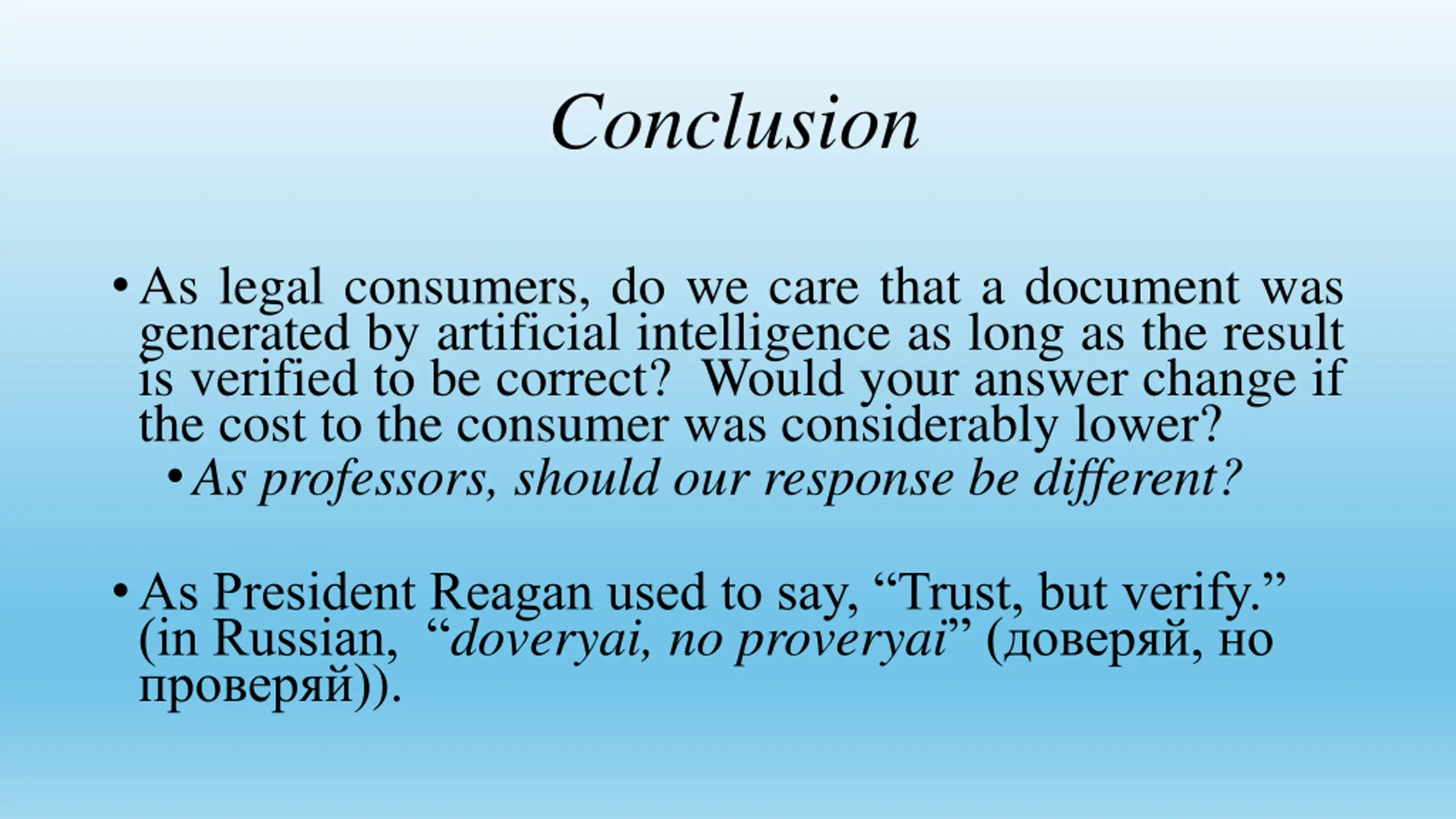 Conclusion As legal consumers, do we care that a document was generated by artificial intelligence as long as the result is verified to be correct? Would your answer change if the cost to the consumer was considerably lower? As professors, should our response be different? As President Reagan used to say, Trust, but verify. (in Russian, doveryai, no proveryai ( , )).