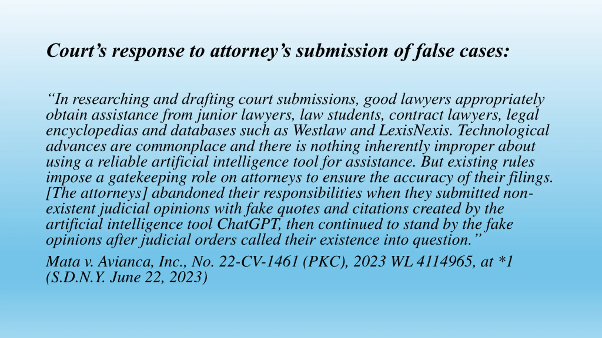 Courts response to attorneys submission of false cases: In researching and drafting court submissions, good lawyers appropriately obtain assistance from junior lawyers, law students, contract lawyers, legal encyclopedias and databases such as Westlaw and LexisNexis. Technological advances are commonplace and there is nothing inherently improper about using a reliable artificial intelligence tool for assistance. But existing rules impose a gatekeeping role on attorneys to ensure the accuracy of their filings. [The attorneys] abandoned their responsibilities when they submitted non- existent judicial opinions with fake quotes and citations created by the artificial intelligence tool ChatGPT, then continued to stand by the fake opinions after judicial orders called their existence into question. Mata v. Avianca, Inc., No. 22-CV-1461 (PKC), 2023 WL 4114965, at *1 (S.D.N.Y. June 22, 2023)