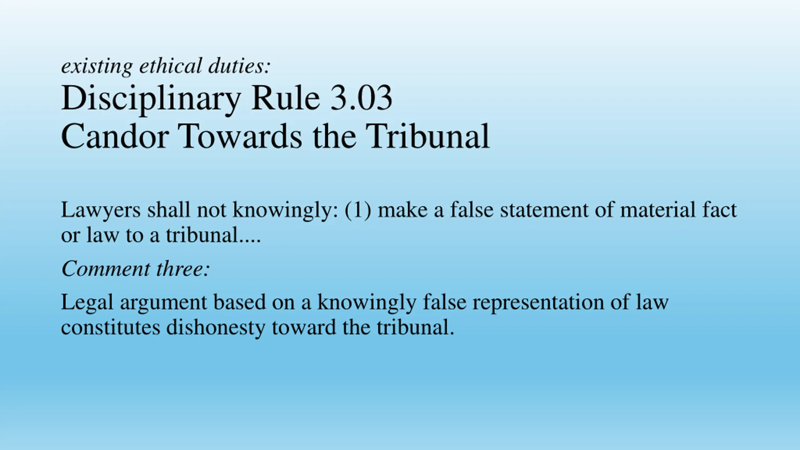 existing ethical duties: Disciplinary Rule 3.03 Candor Towards the Tribunal Lawyers shall not knowingly: (1) make a false statement of material fact or law to a tribunal.... Comment three: Legal argument based on a knowingly false representation of law constitutes dishonesty toward the tribunal.