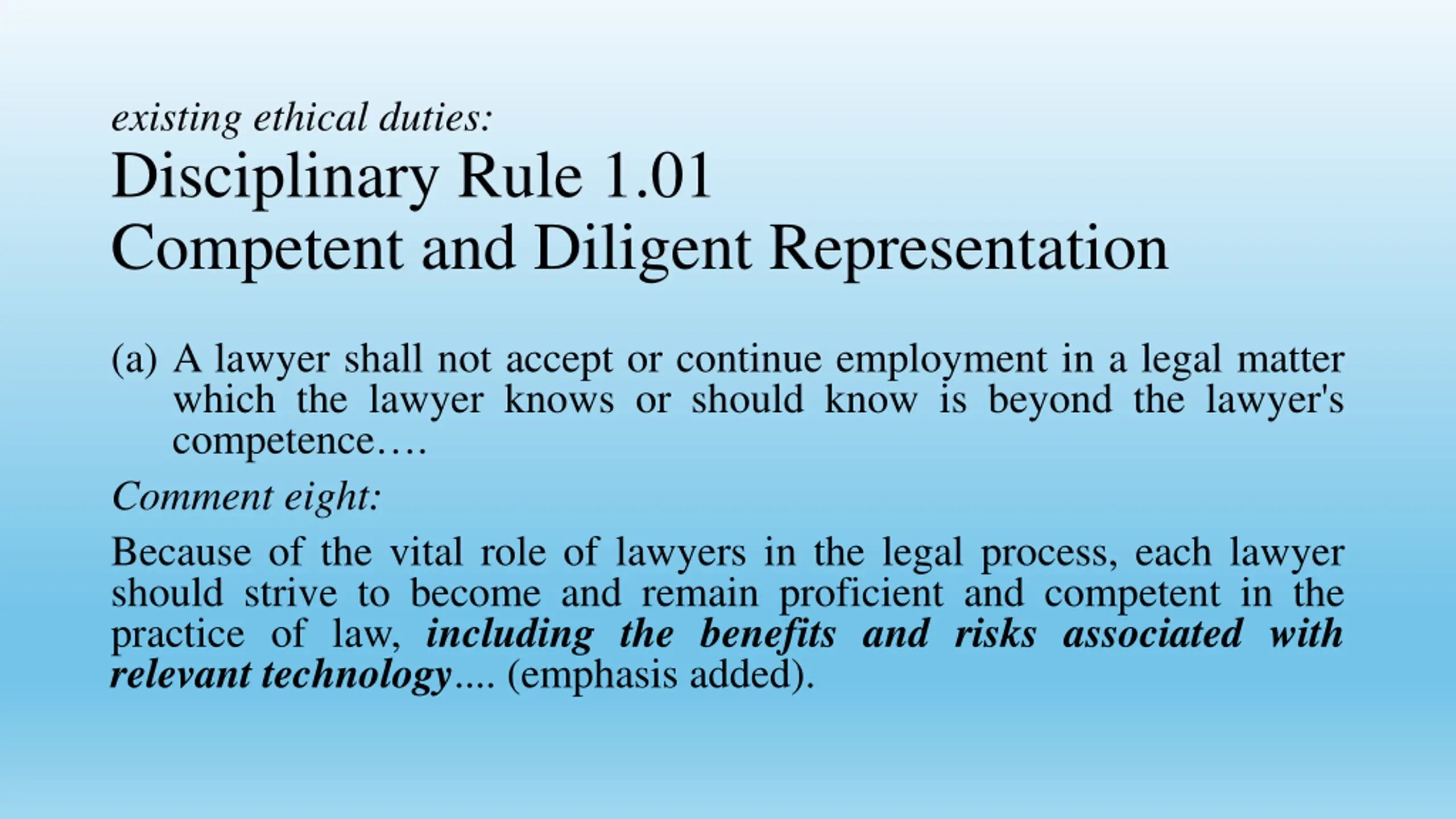 existing ethical duties: Disciplinary Rule 1.01 Competent and Diligent Representation (a) A lawyer shall not accept or continue employment in a legal matter which the lawyer knows or should know is beyond the lawyer's competence . Comment eight: Because of the vital role of lawyers in the legal process, each lawyer should strive to become and remain proficient and competent in the practice of law, including the benefits and risks associated with relevant technology.... (emphasis added).