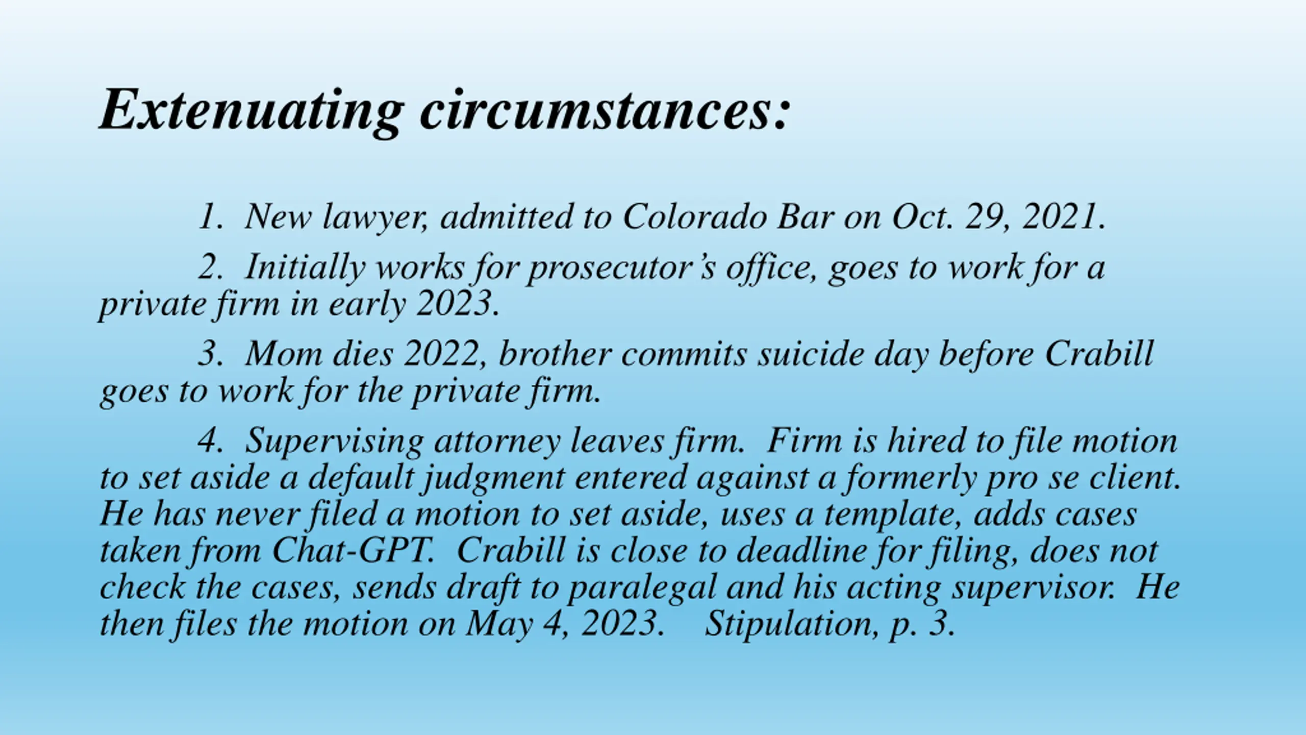 Extenuating circumstances: 1. New lawyer, admitted to Colorado Bar on Oct. 29, 2021. 2. Initially works for prosecutor s office, goes to work for a private firm in early 2023. 3. Mom dies 2022, brother commits suicide day before Crabill goes to work for the private firm. 4. Supervising attorney leaves firm. Firm is hired to file motion to set aside a default judgment entered against a formerly pro se client. He has never filed a motion to set aside, uses a template, adds cases taken from Chat-GPT. Crabill is close to deadline for filing, does not check the cases, sends draft to paralegal and his acting supervisor. He then files the motion on May 4, 2023. Stipulation, p. 3.
